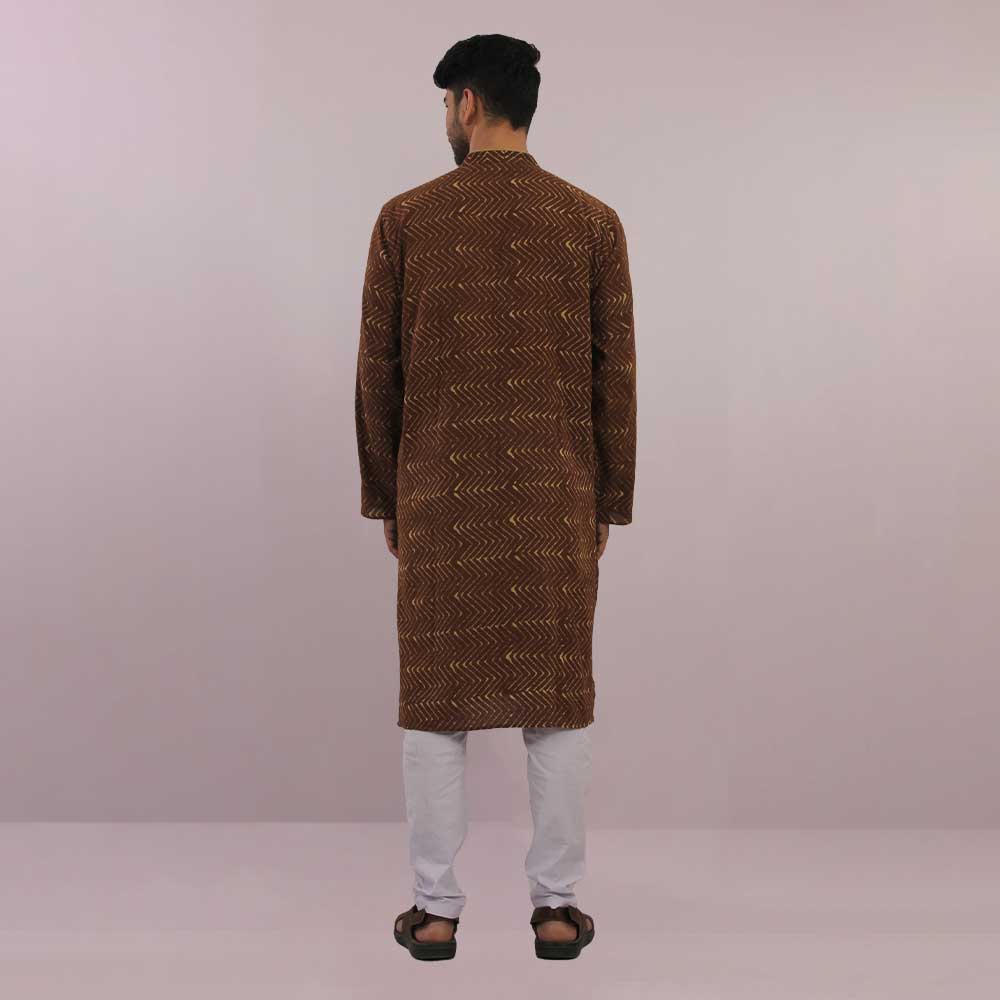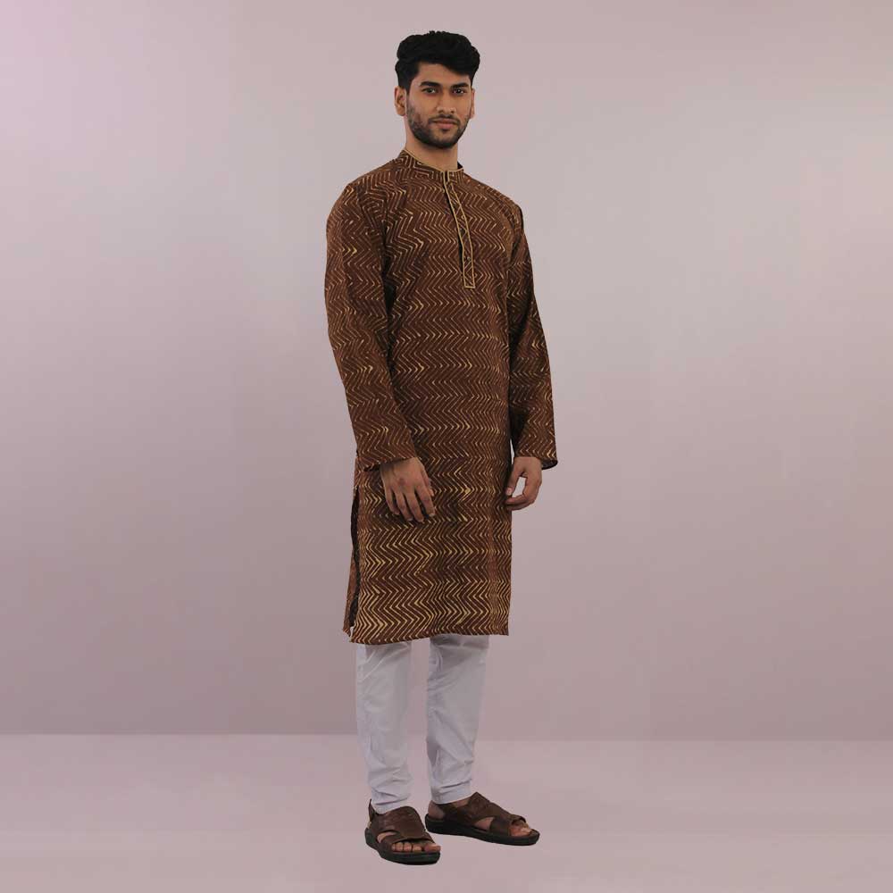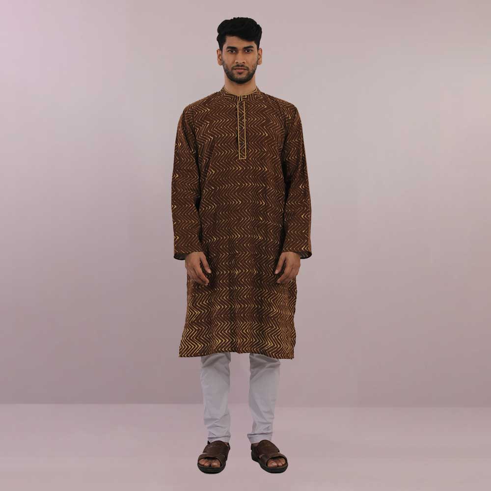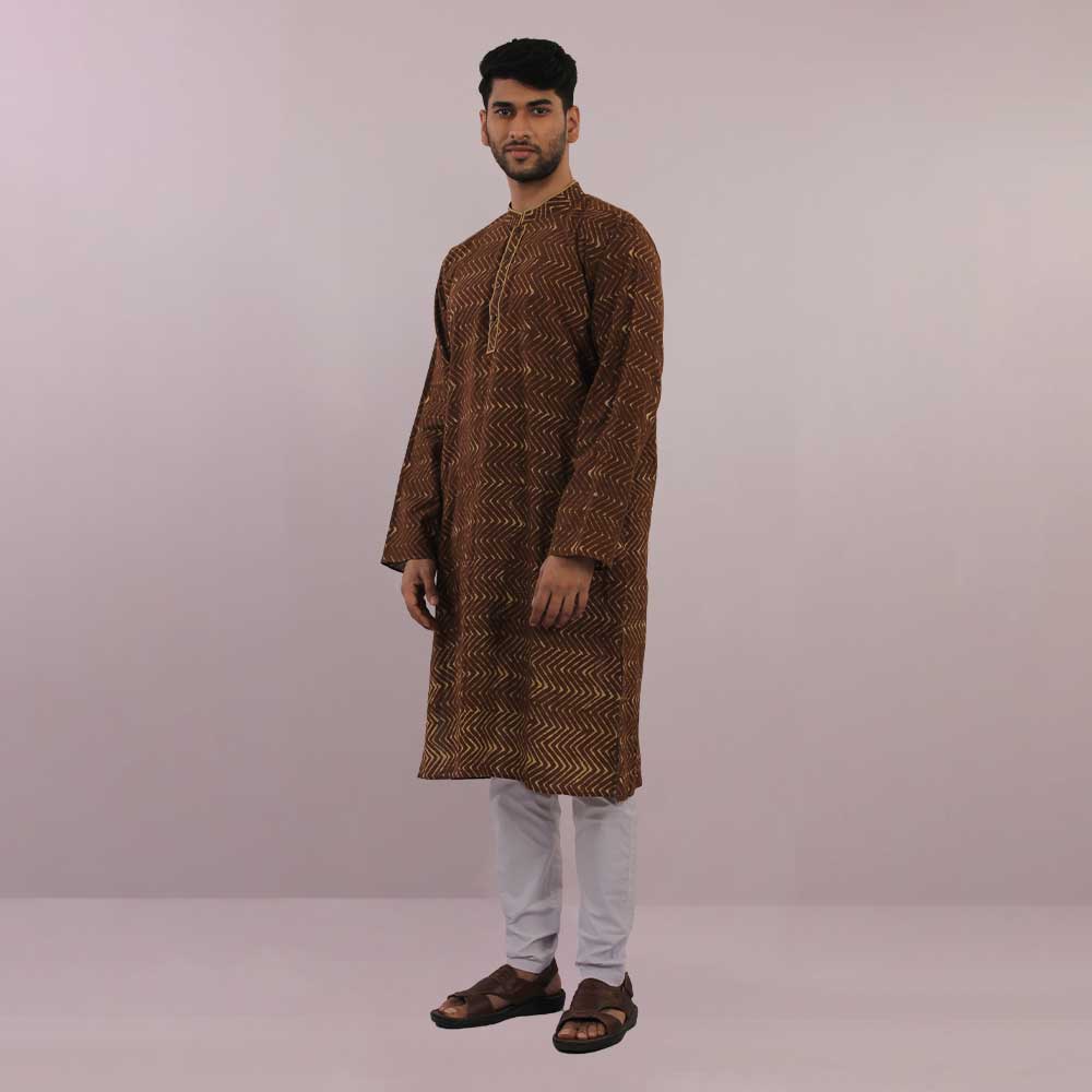 This cotton panjabi brings in the hues of brown from nature. The process of surface ornamentation unveils the unique designs of this panjabi.