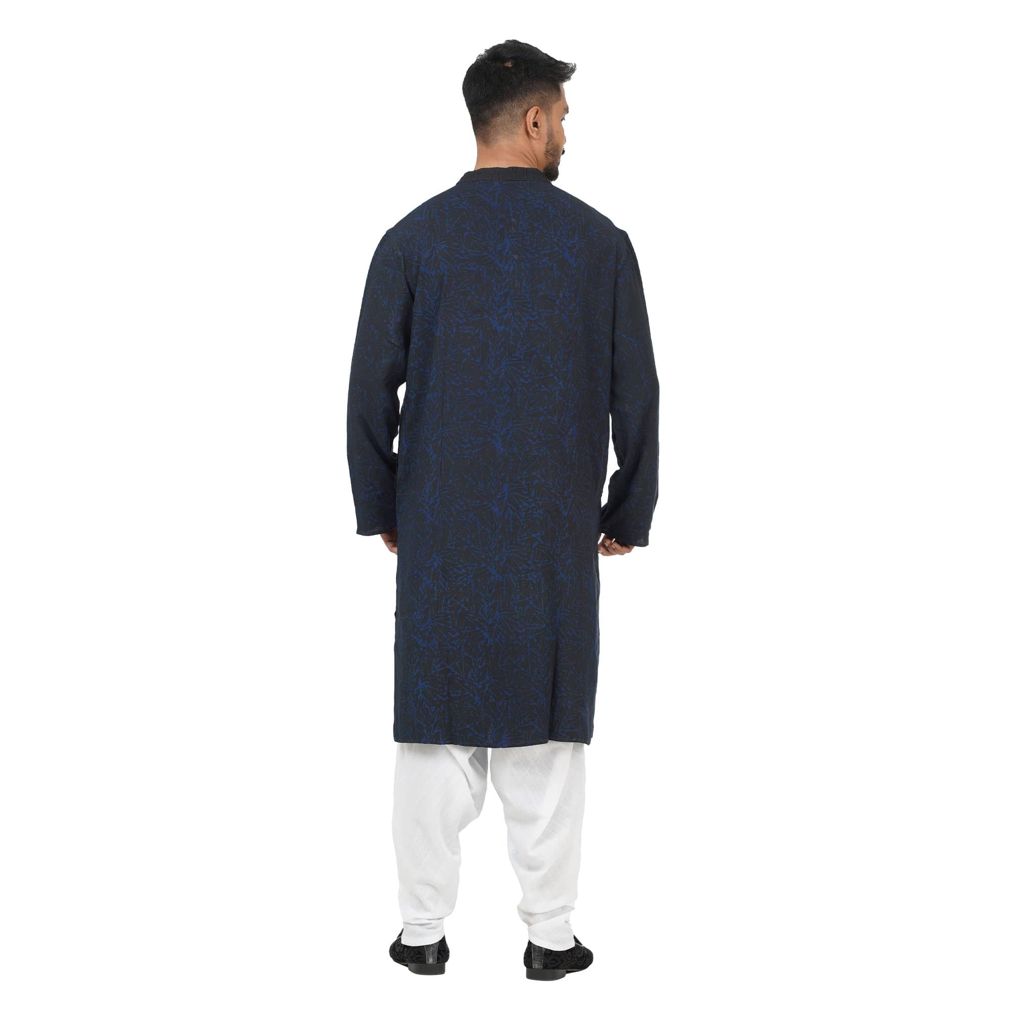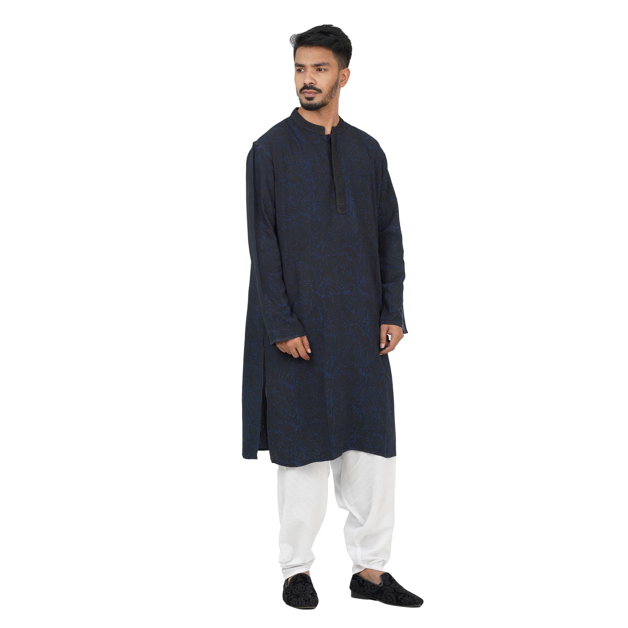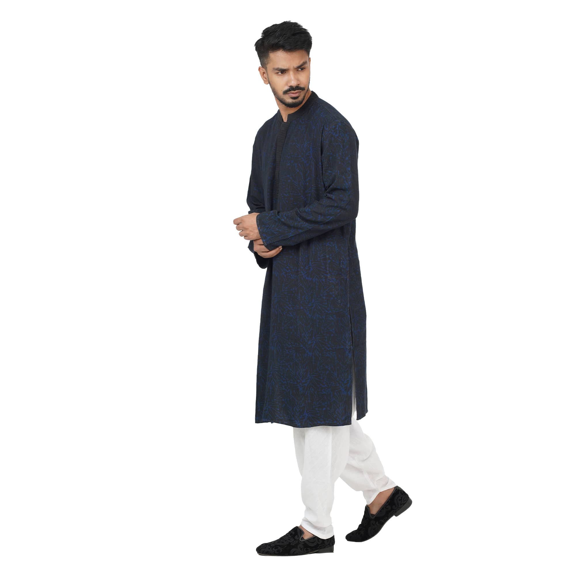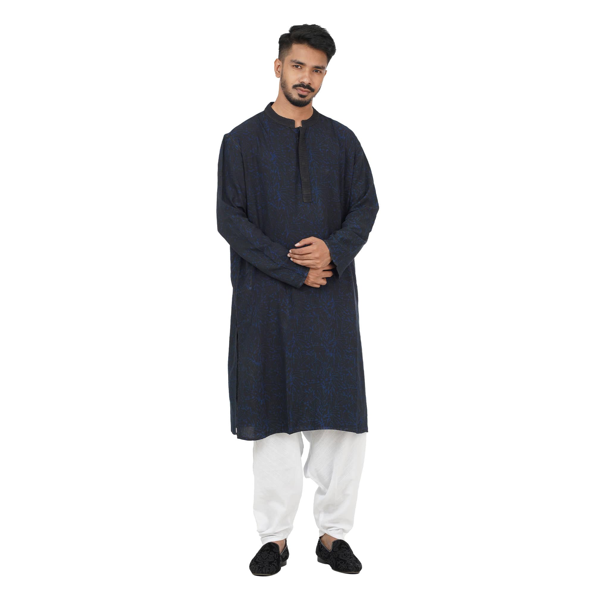 This blue and black abstract printed natural dyed panjabi is made from linen fabric which is comfortable for this summer season. All Aranya products are handmade, using natural fibers and materials within a fair trade framework.