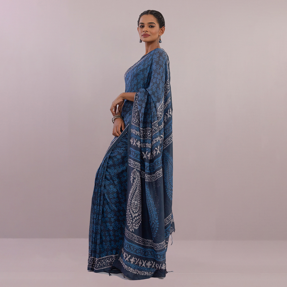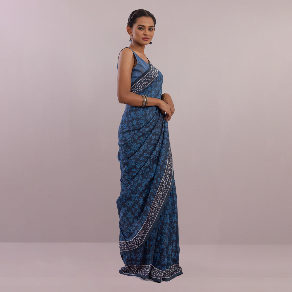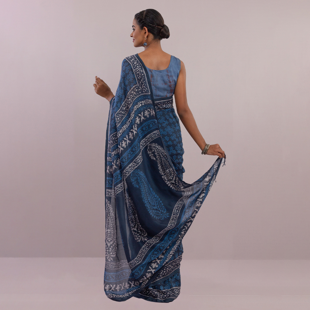 With the impulsive color of blue, this half silk saree comes from the essence of nature. Wax-resistant dye was used to enhance the appearance with exclusive designs.