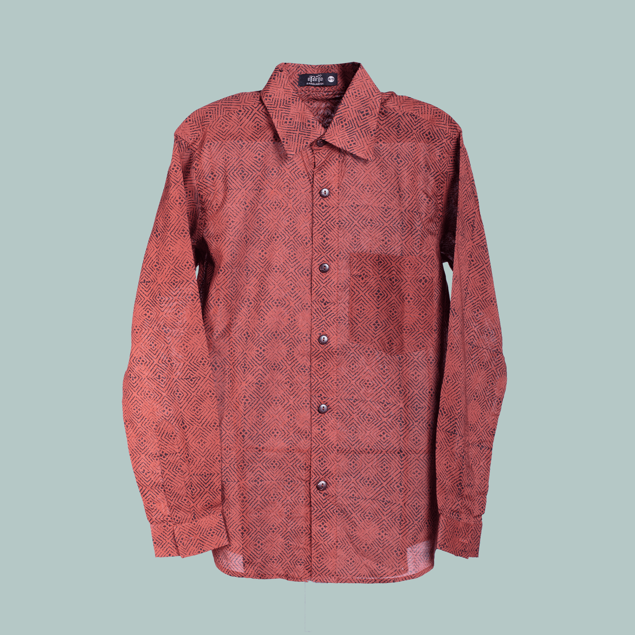 Handmade block-printed creates the beauty in this pure cotton kids Shirt with a rich appearance and with the application of Natural red and black come from the natural essence of madder and black kashmi. All Aranya products are handmade, using natural materials, within a fair trade framework.