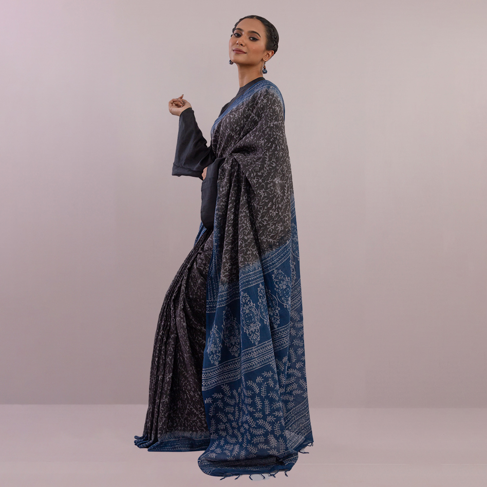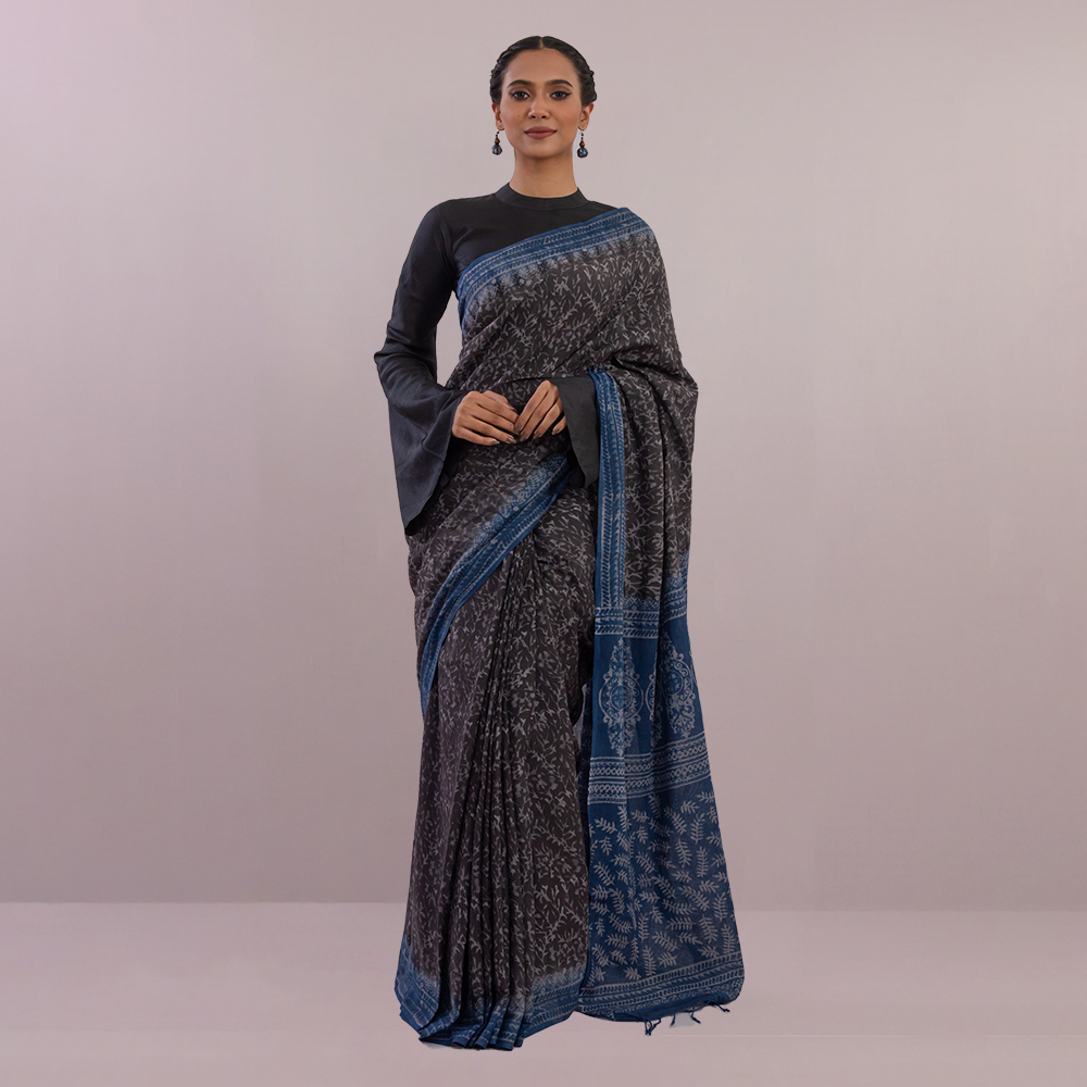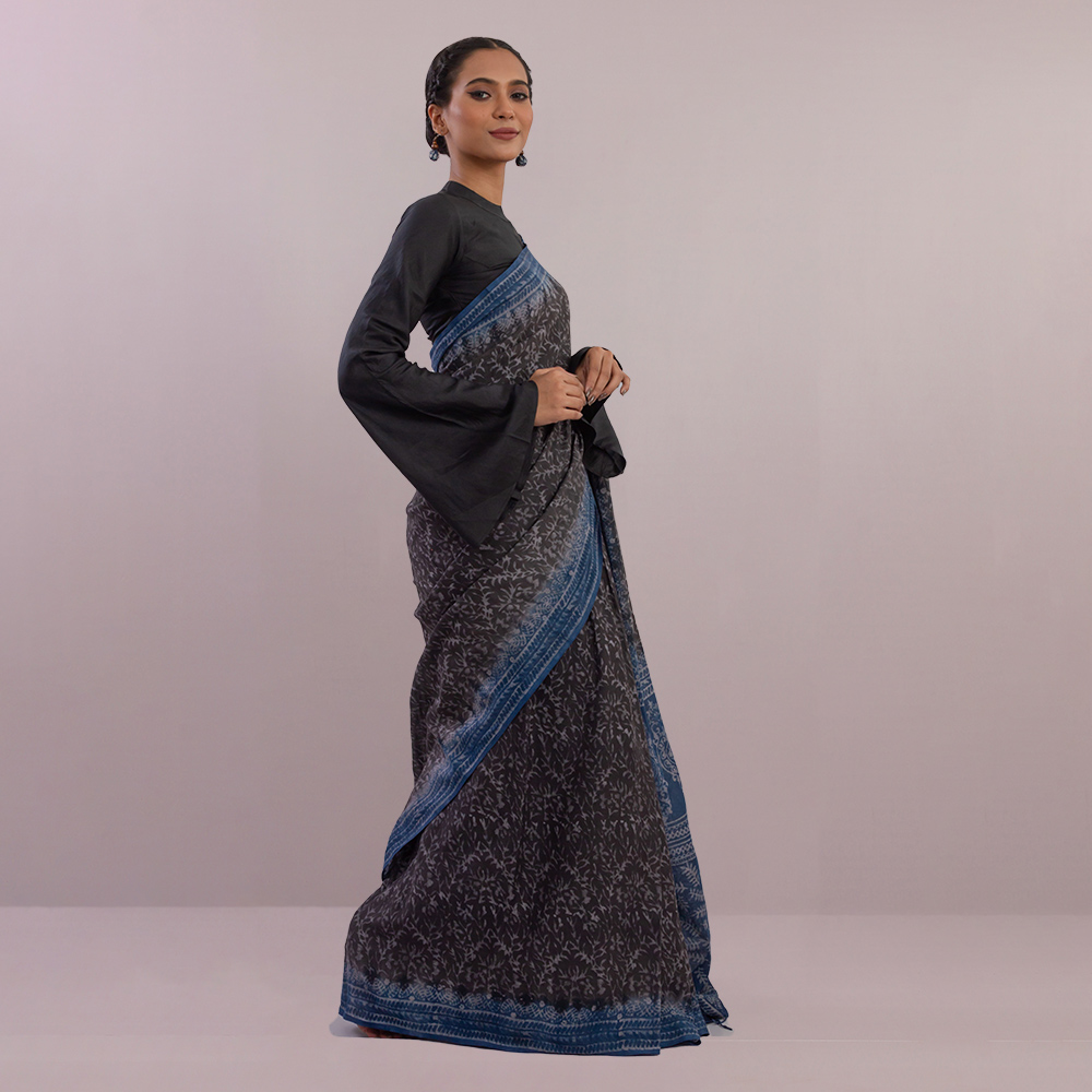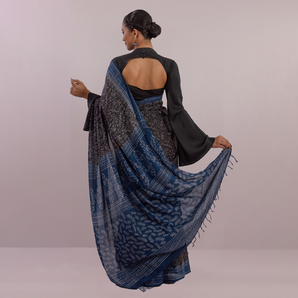 This Wax printed cotton saree was dyed using the natural ingredients to bring out the marvelous charcoal grey & navy blue color of the product. All Aranya products are handmade, using natural materials, within a fair trade framework.