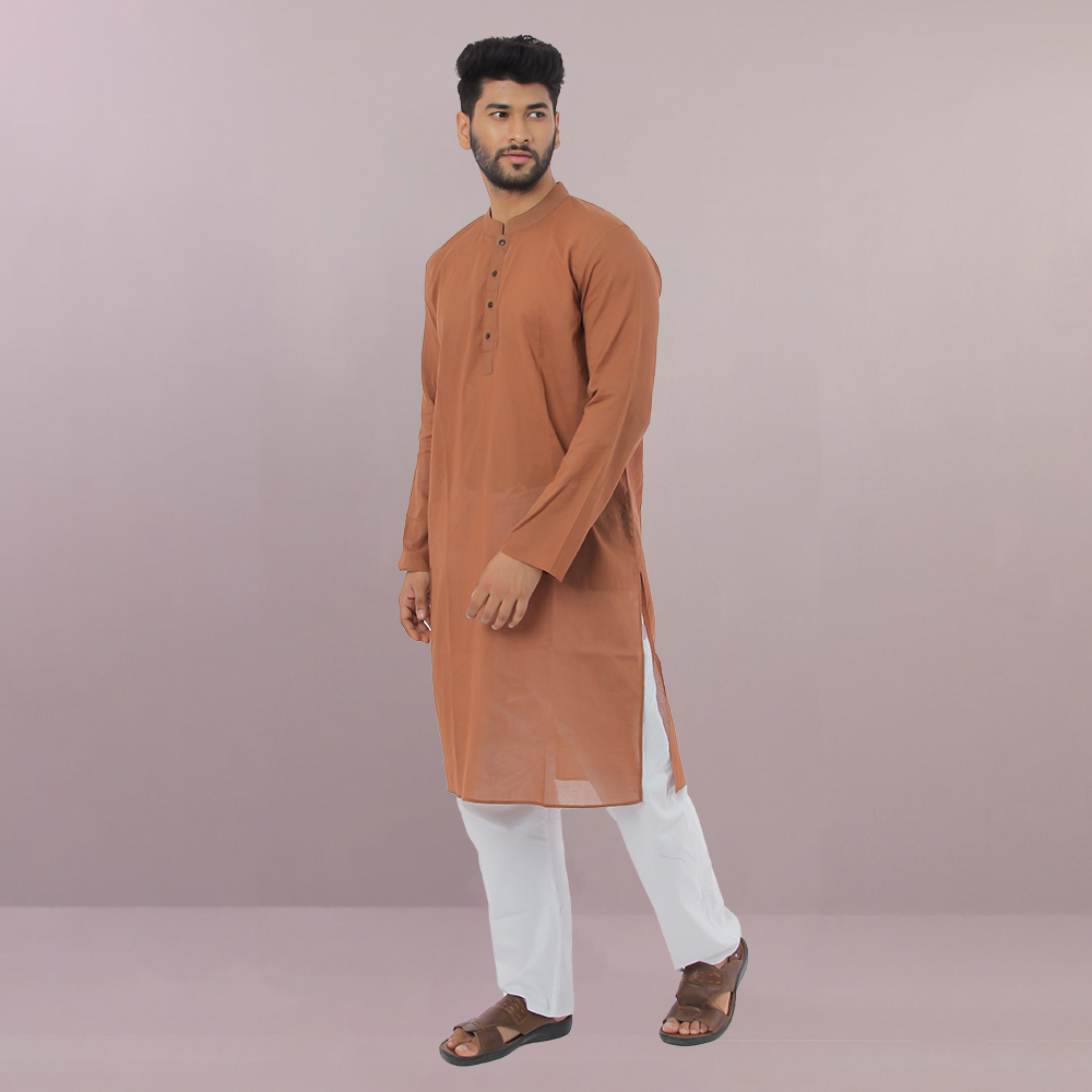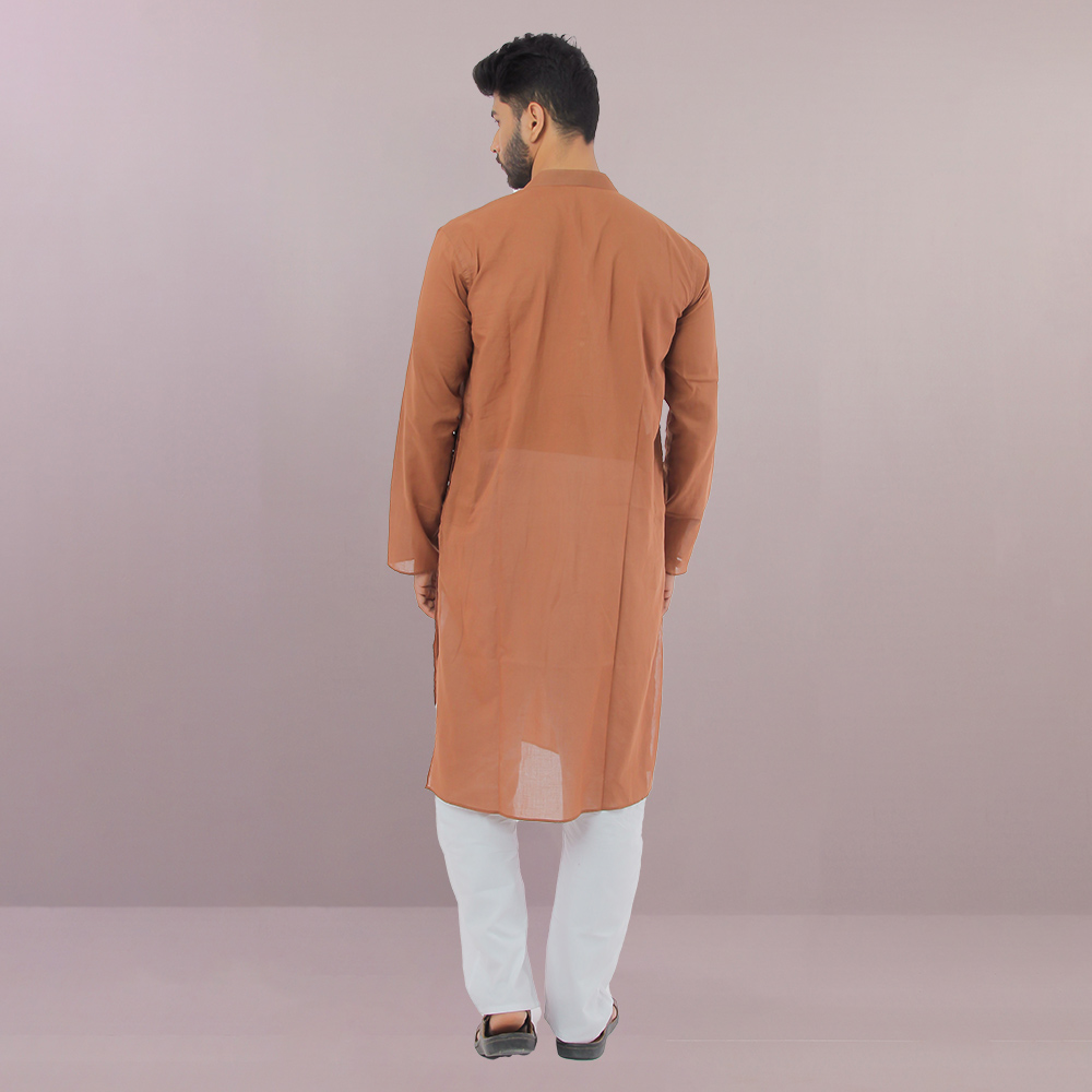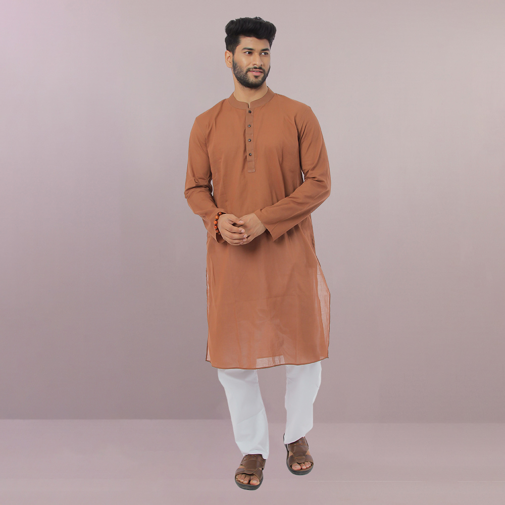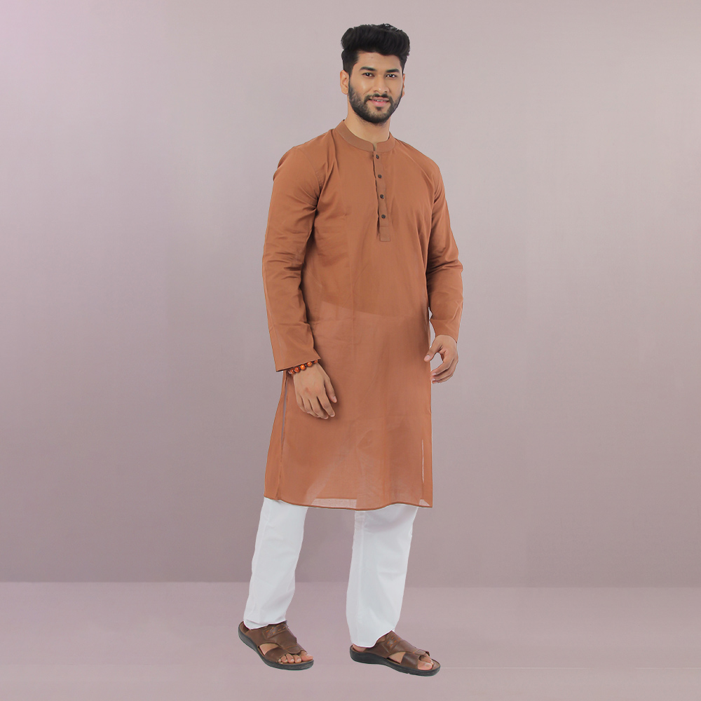 one toned color on this cotton Panjabi, while naturally dyeing with catechu which flourished it’s dark colours fot this panjabi elegent look