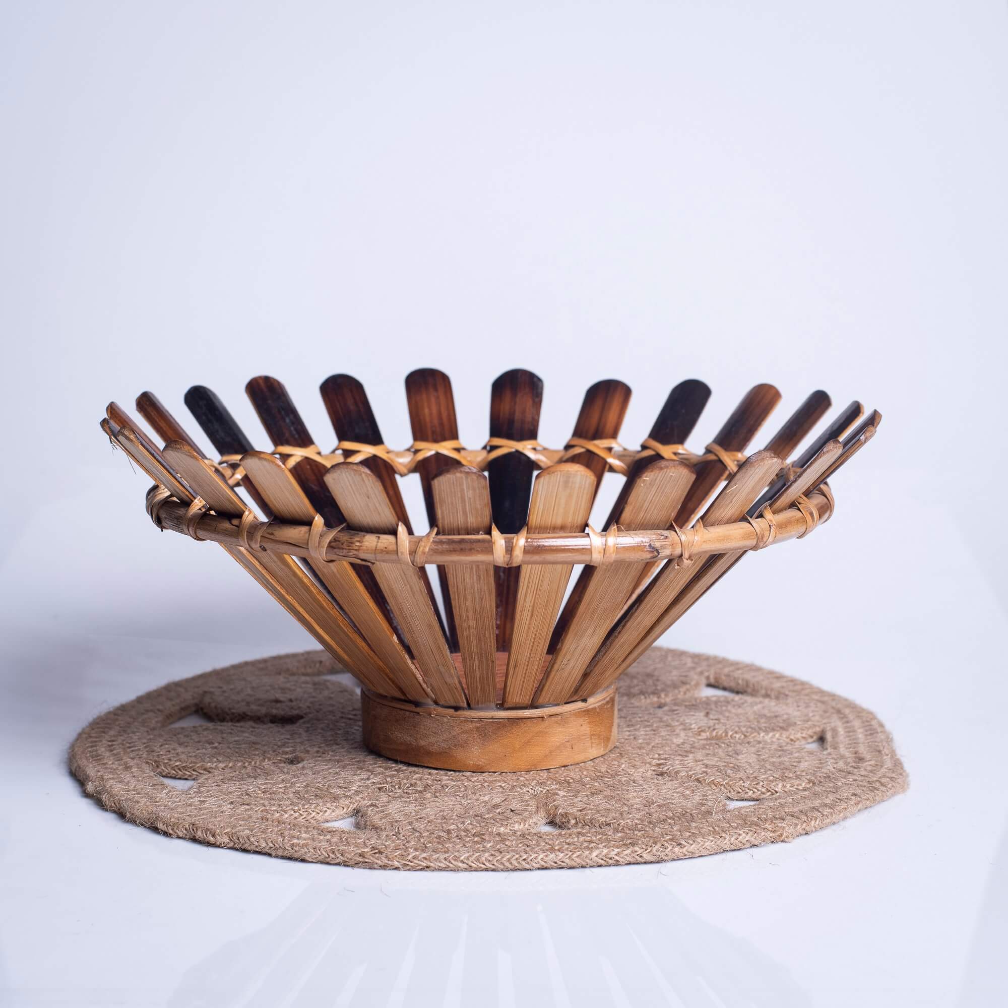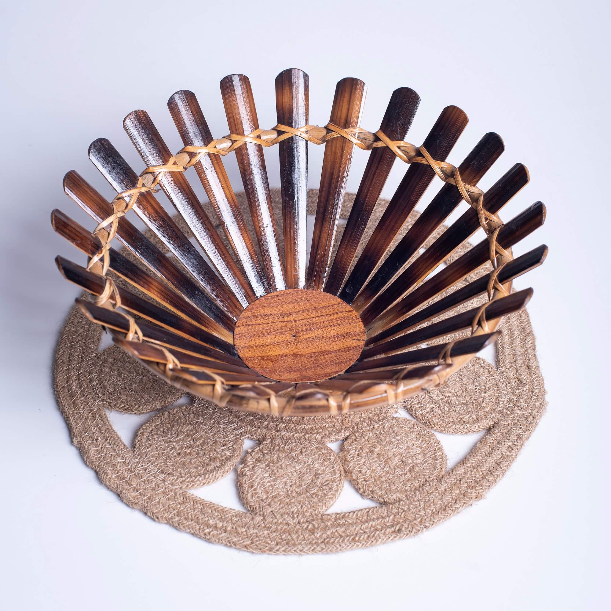 This mesmerizing fruit basket is made from bamboo material. All Aranya products are handmade, using natural fibers and materials within a fair trade framework.