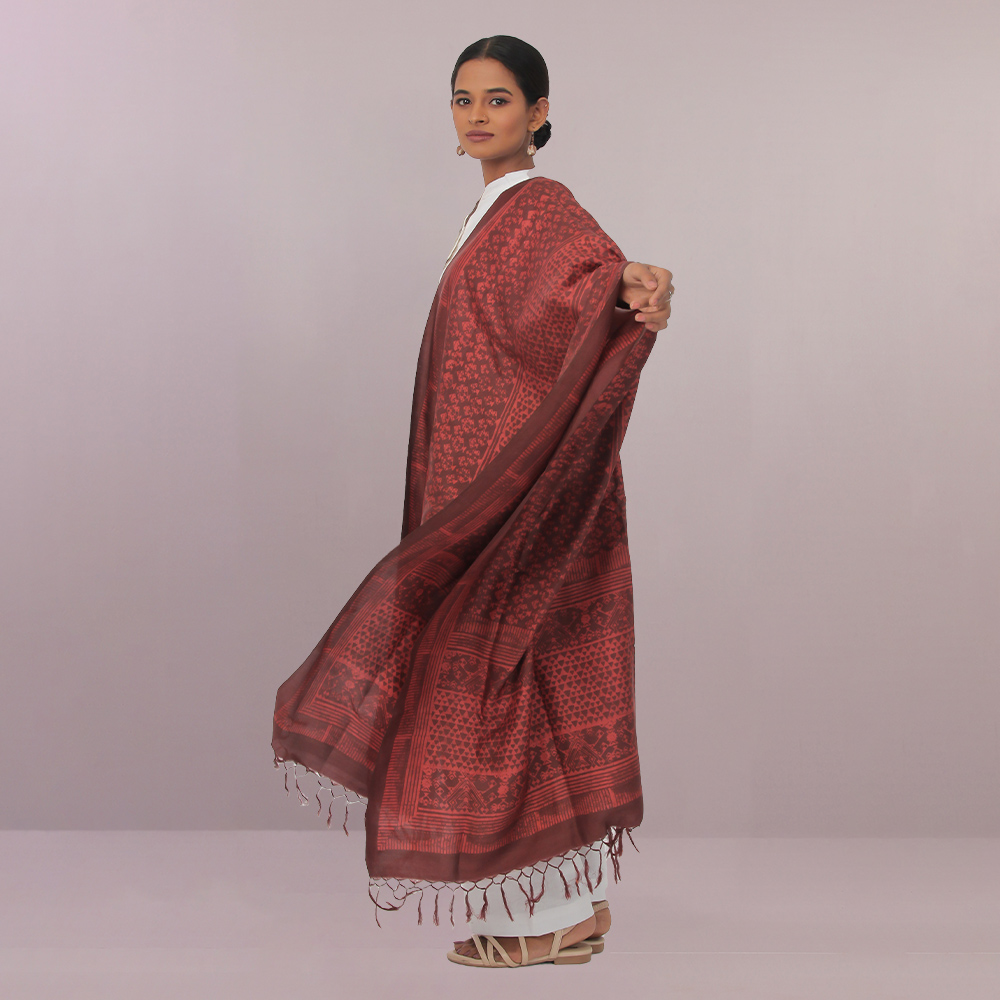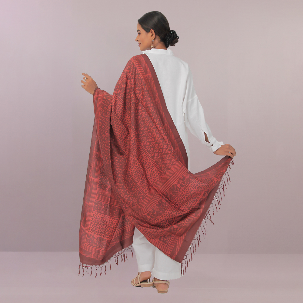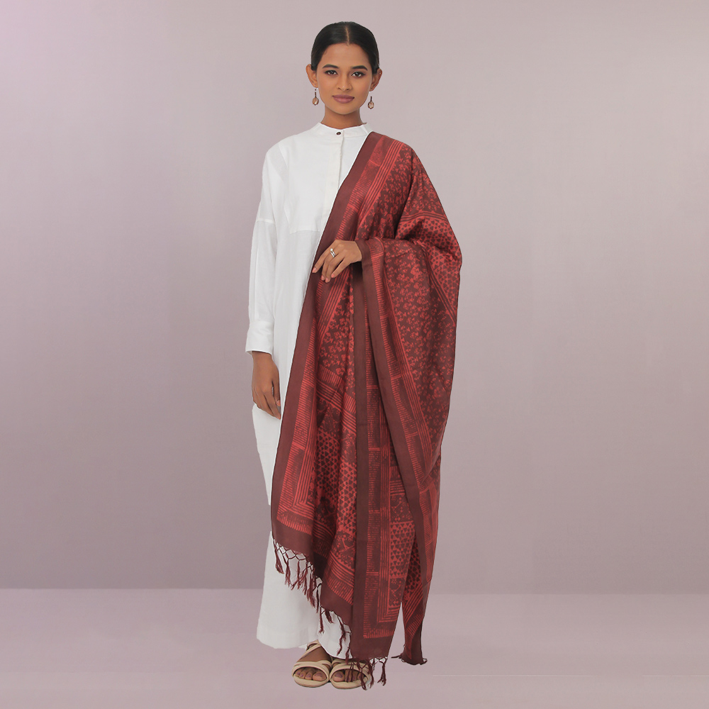 This is an artful geometric wax printed silk orna, which is dyed in madder to get the red wine color. All Aranya products are handmade, using natural materials, within a fair trade framework.