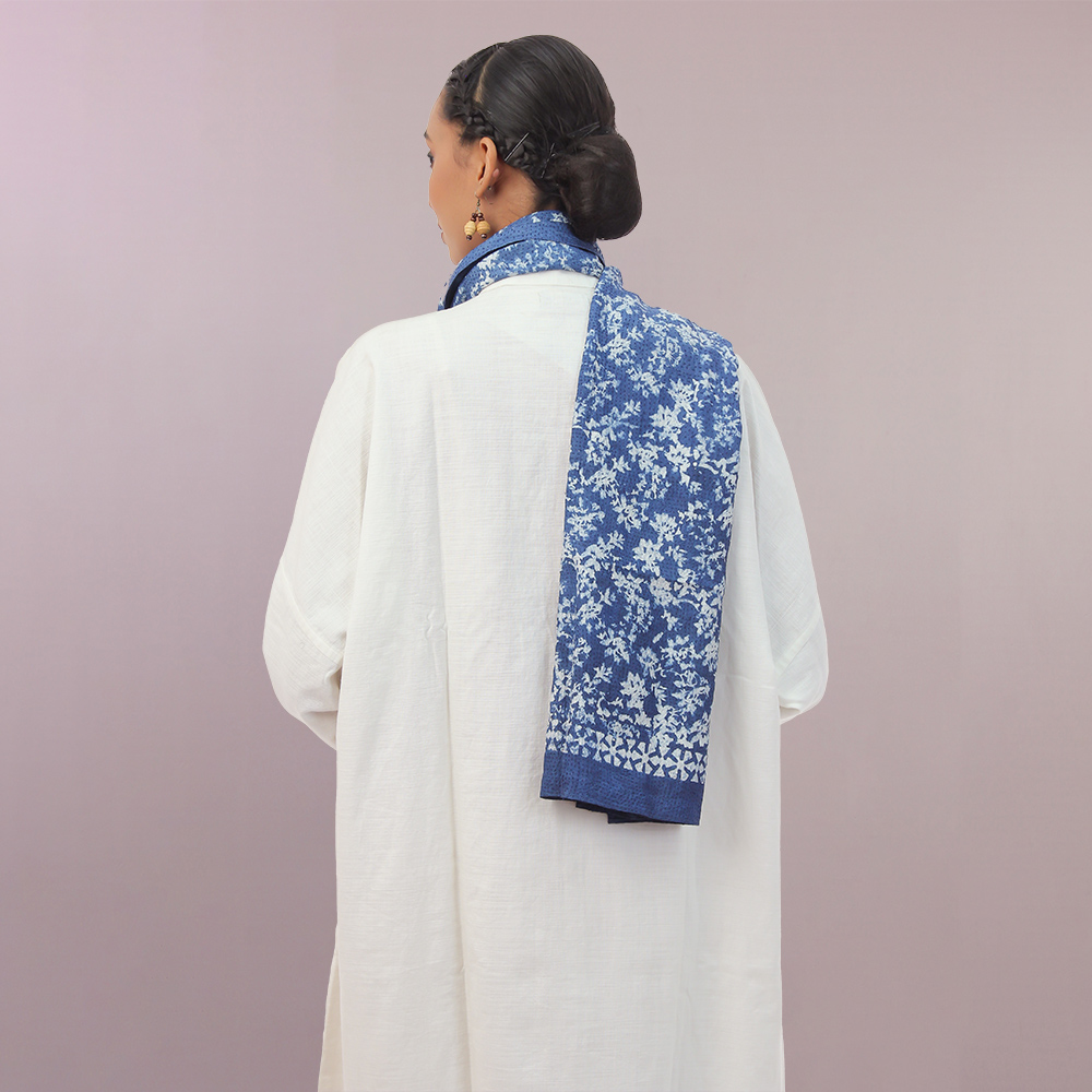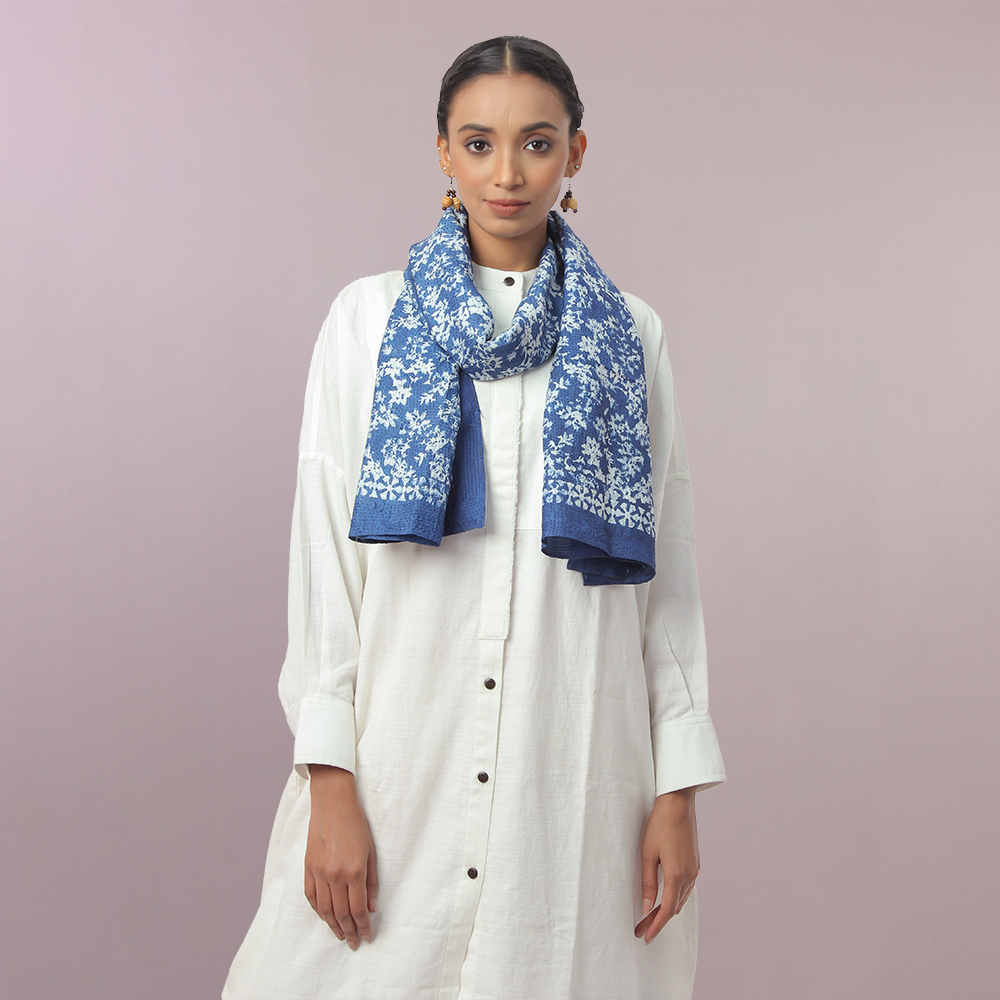 This silk kantha scarf is gently and naturally dyed in natural ingredient for indogo color and wax print is applied for the ornamentation.