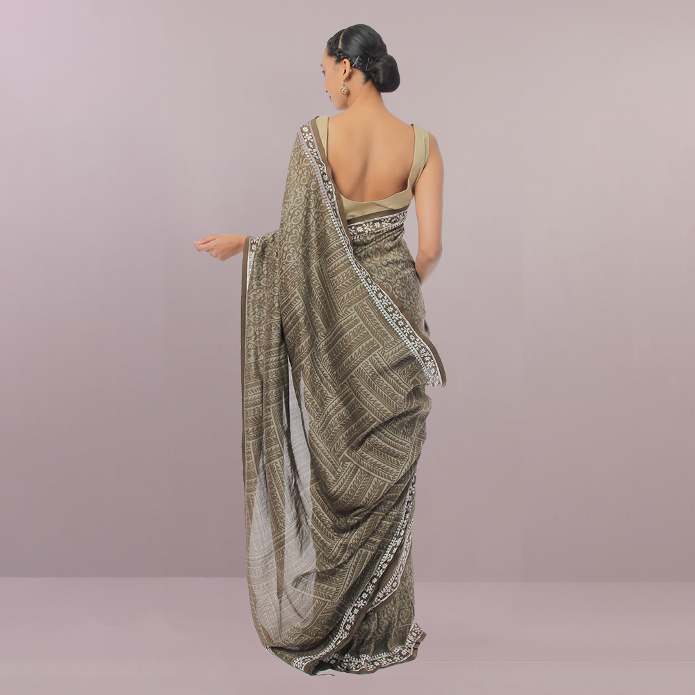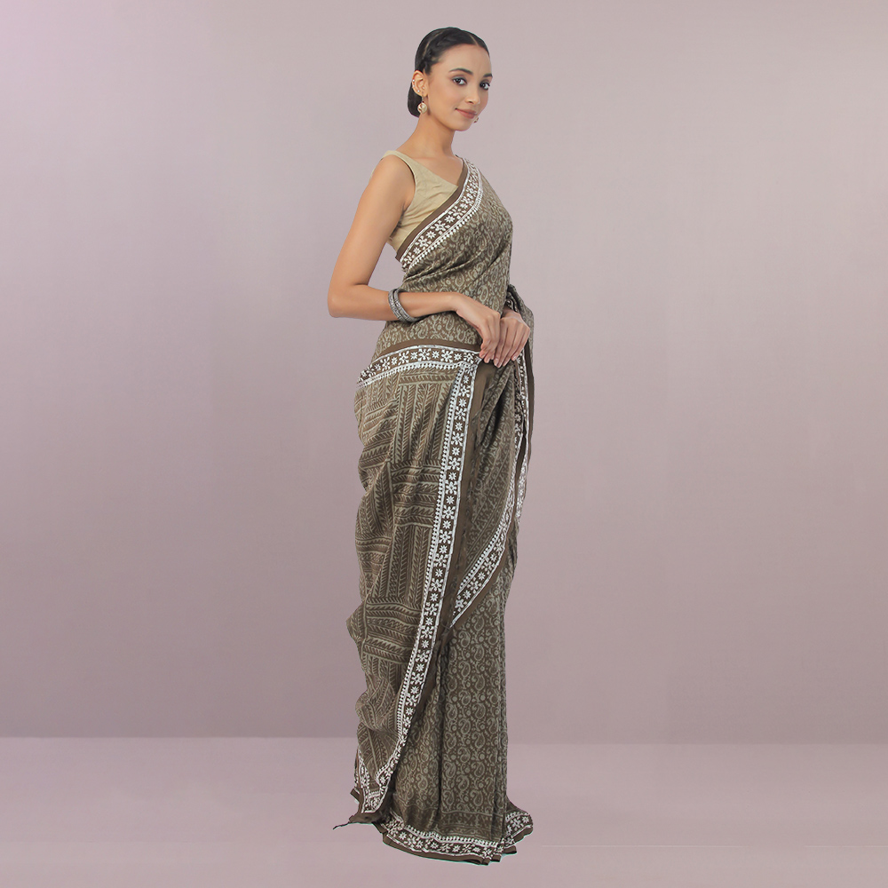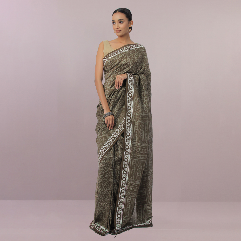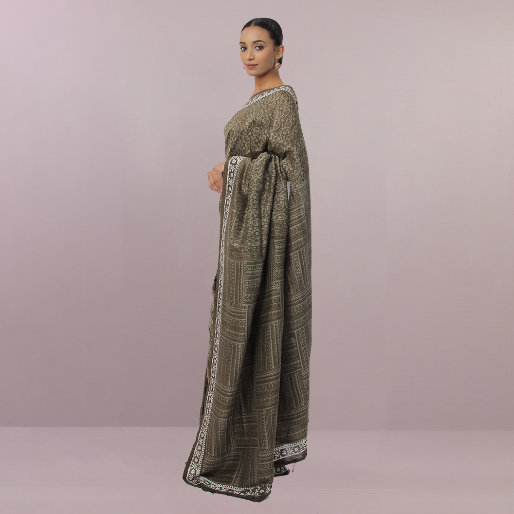 This Wax printed Silk saree was dyed using the natural ingredients to bring out the marvelous dark olive color of the product.
