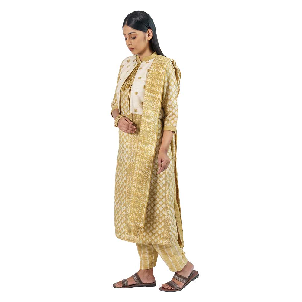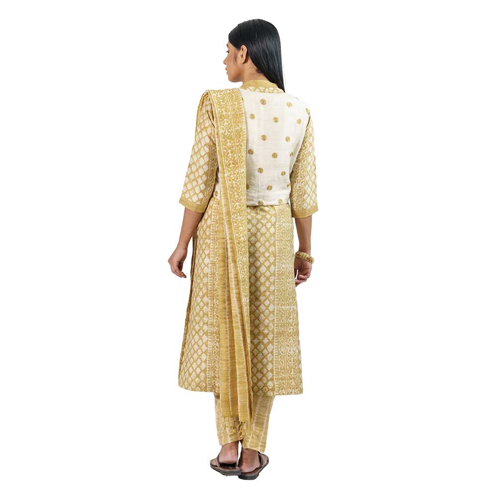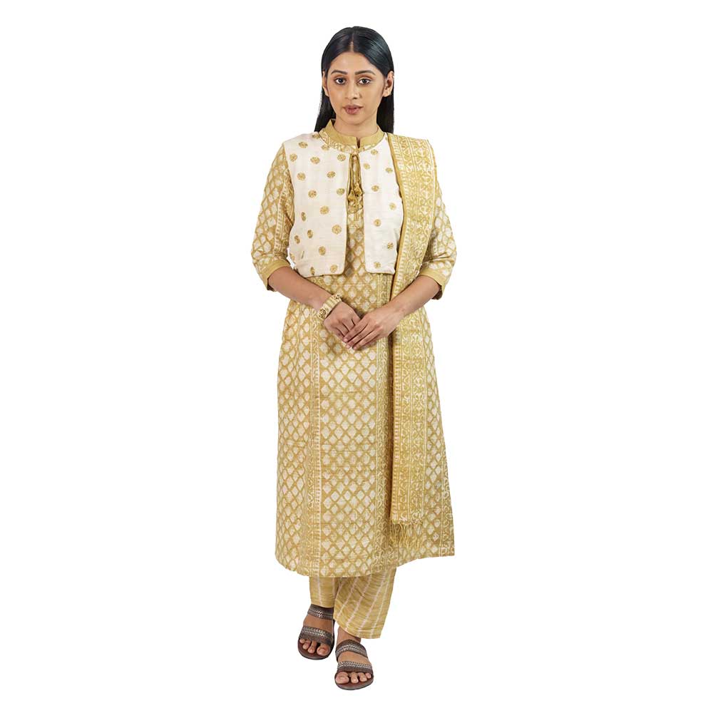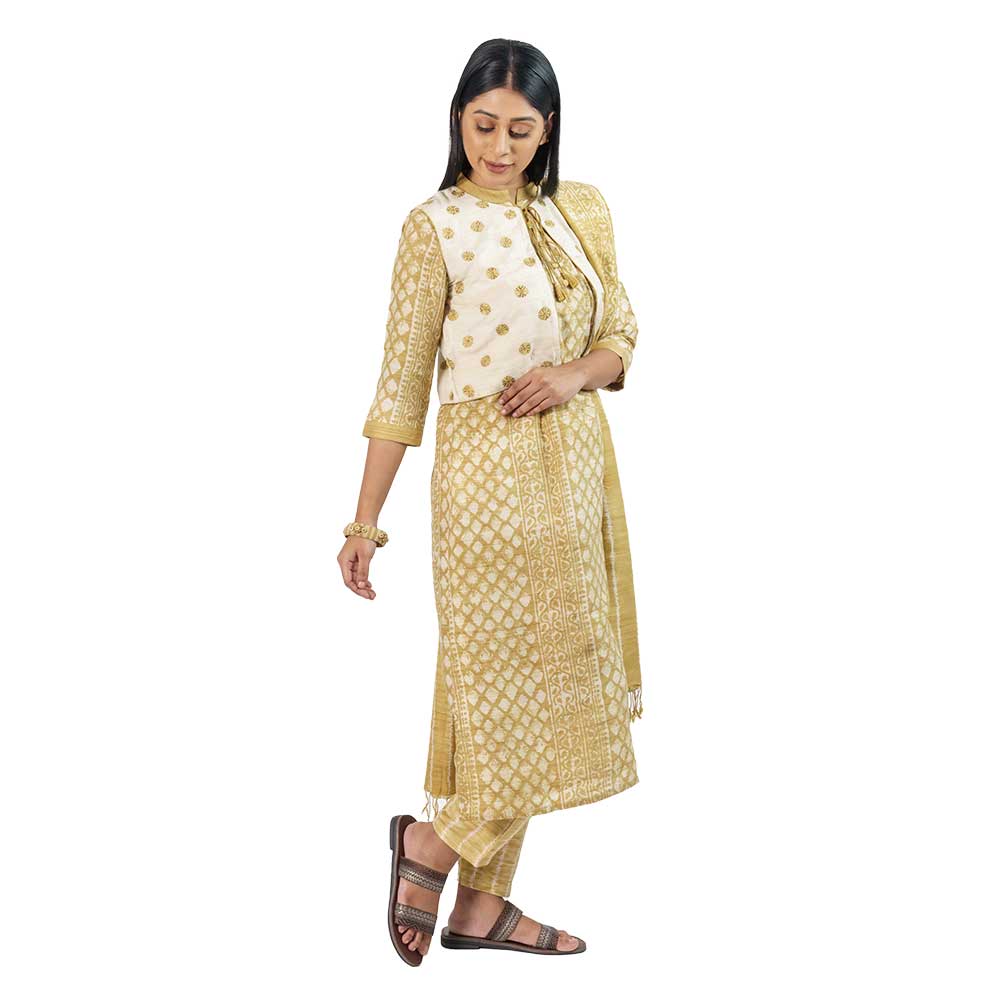 The stunning combination of white and gold is bound to make heads turn. Wear this eri silk suit to any traditional meet and you are guaranteed to be the eye candy.