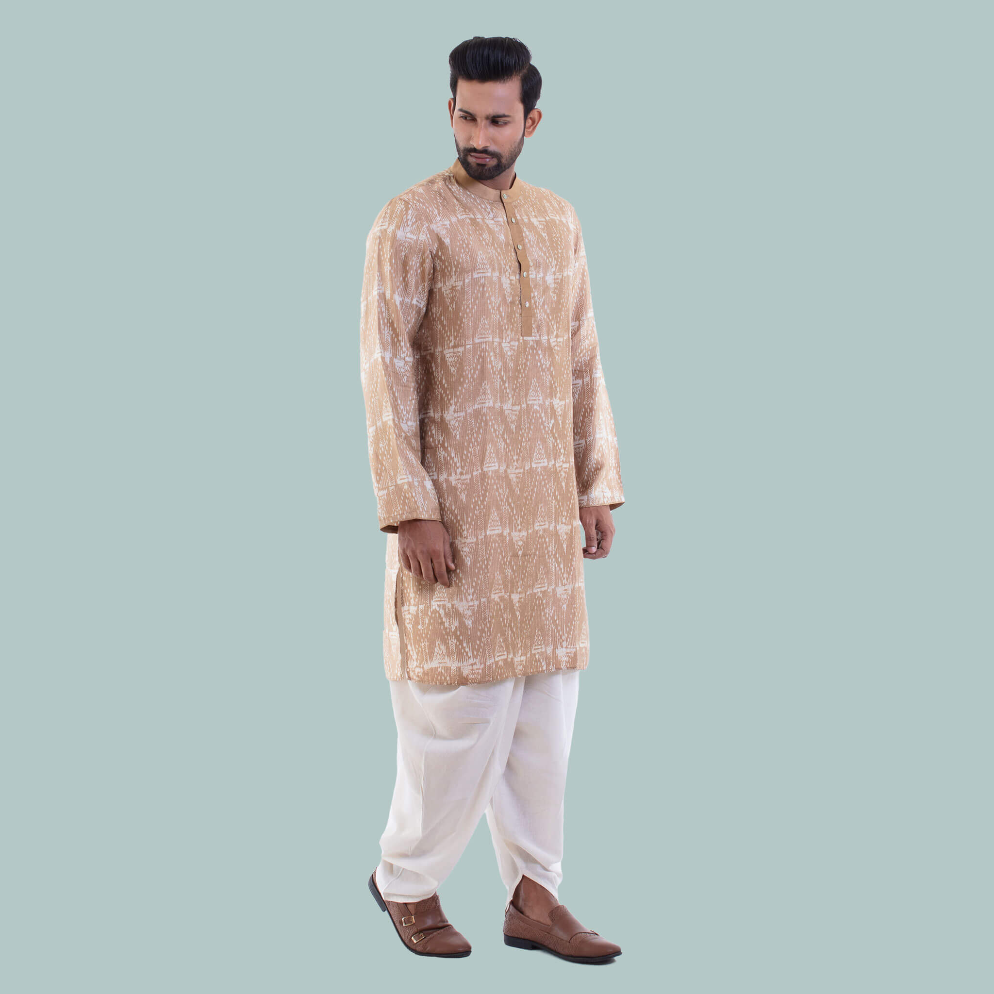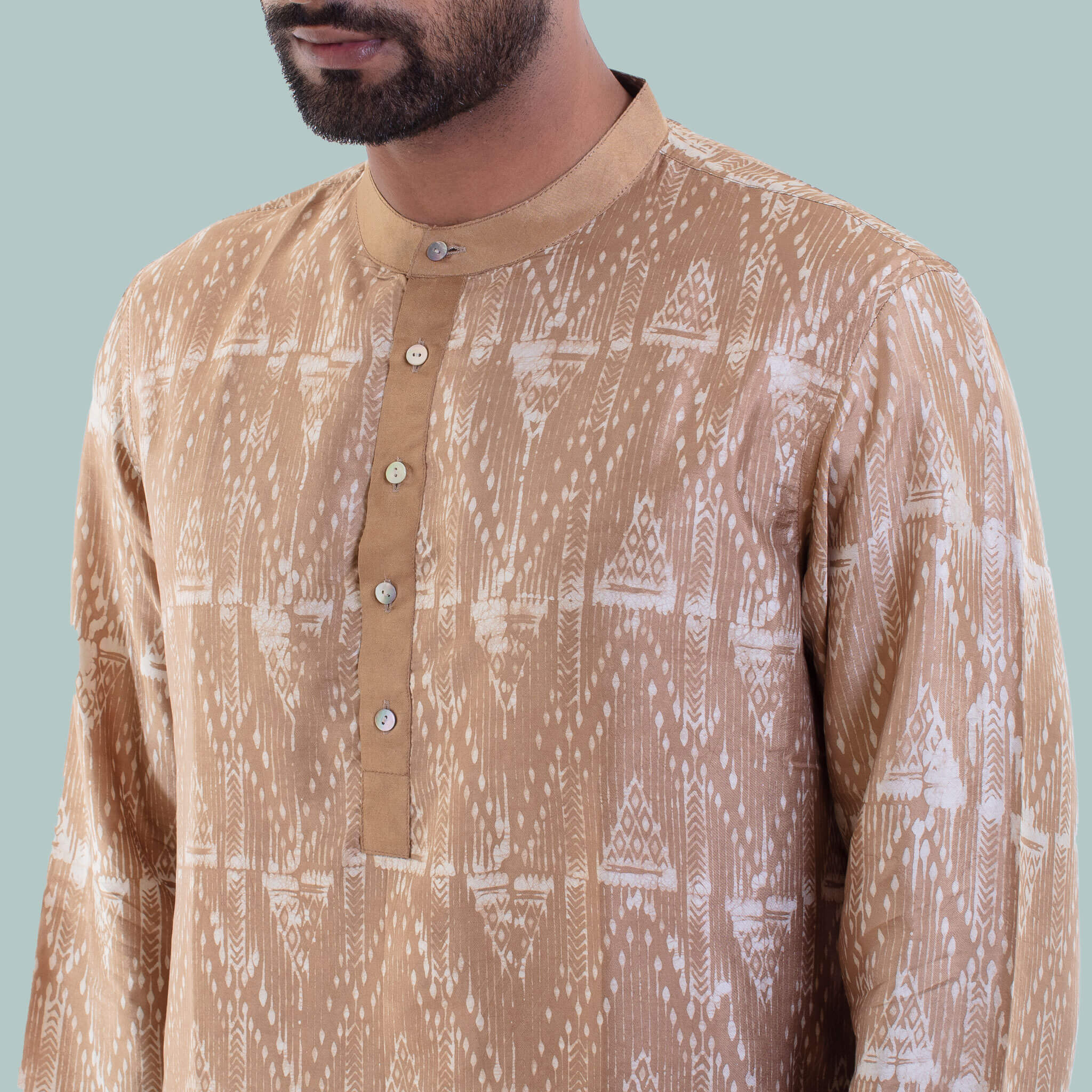 Raintree has been used to derive the color beige on this Pure balaka silk Panjabi. The Wax block technique was used to amplify its bold design. All Aranya products are handmade, using natural materials, within a fair trade framework.