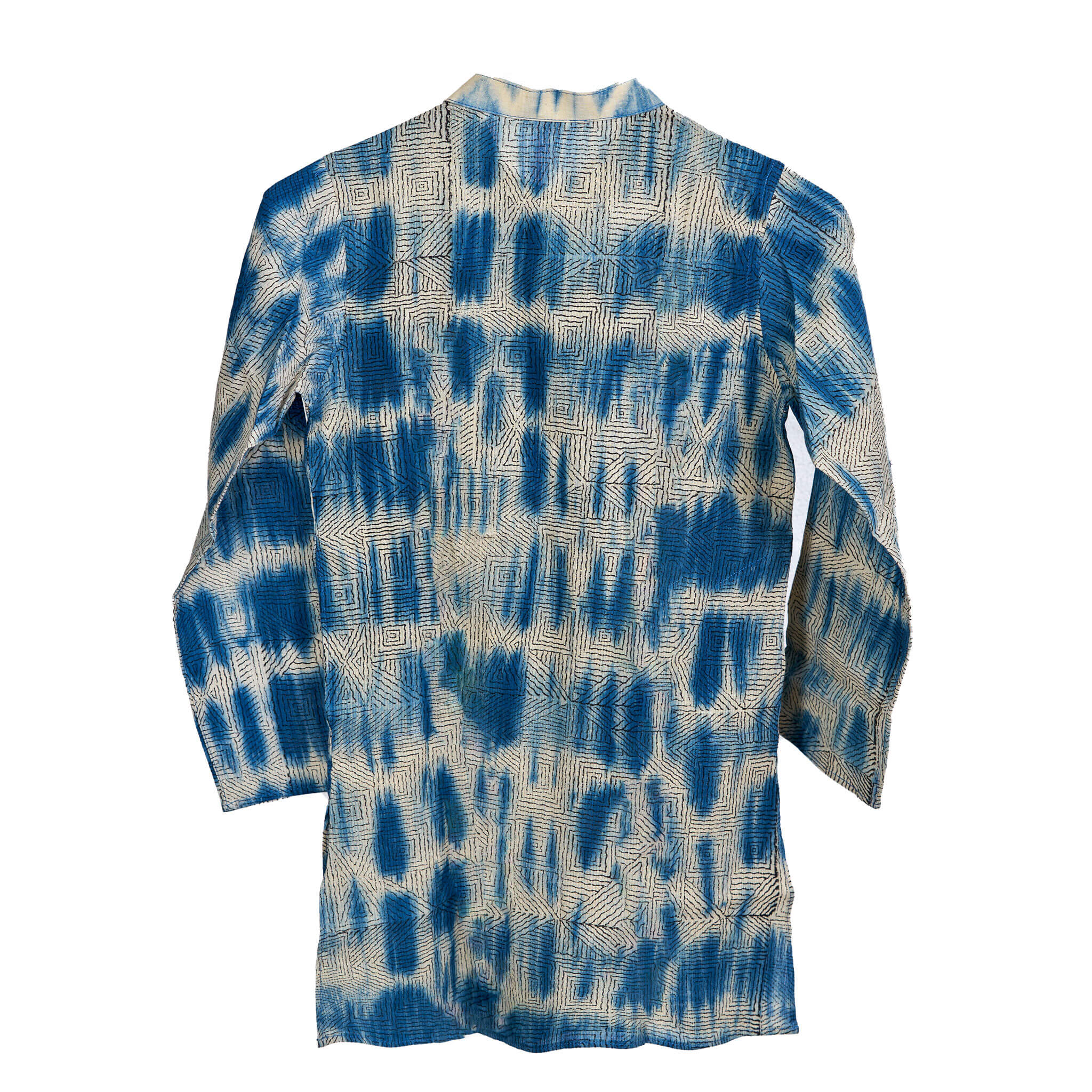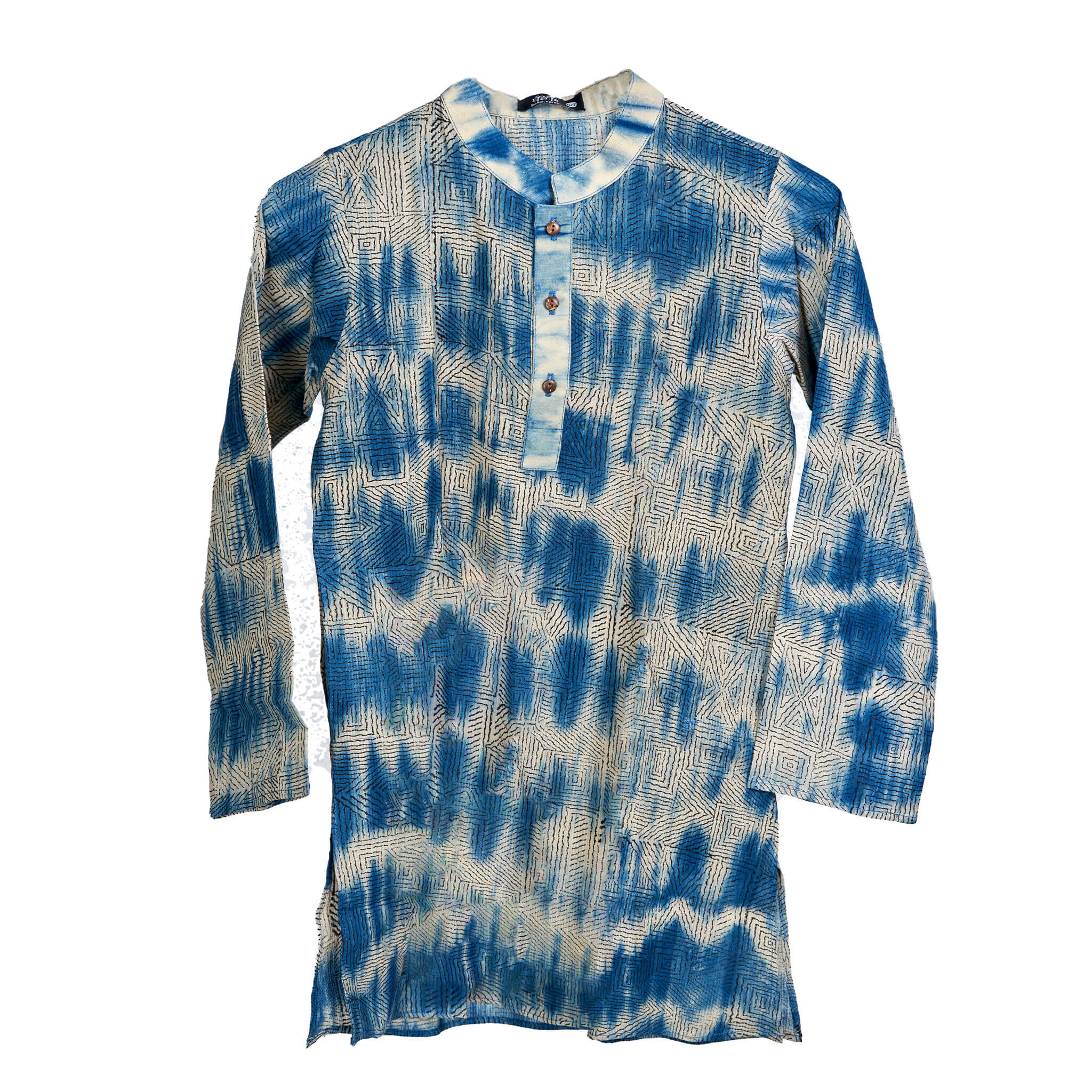 The shiny blue in this Panjabi is taken from an enticing by indigo. Traditional tie-dyeing technique has been used on cotton and black kashmi print to create detailed intricacies. All Aranya products are hand made, using natural fibers and materials within a fair trade framework.