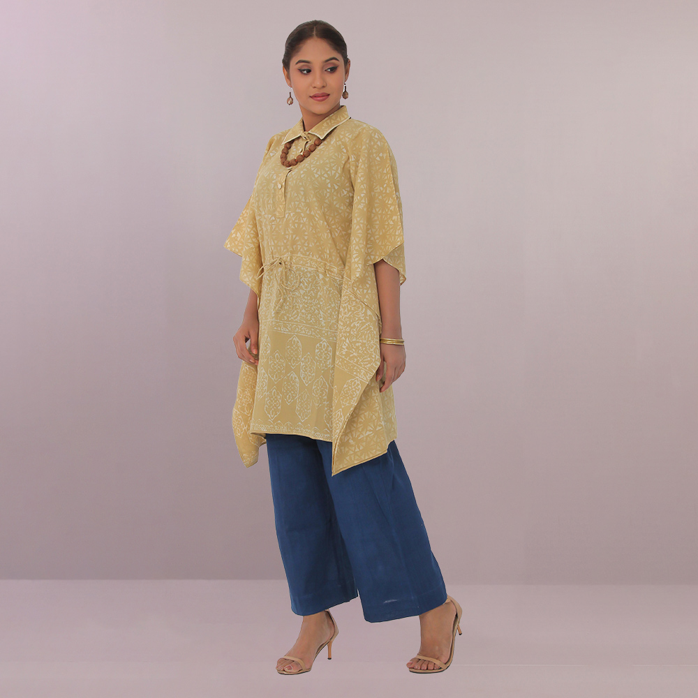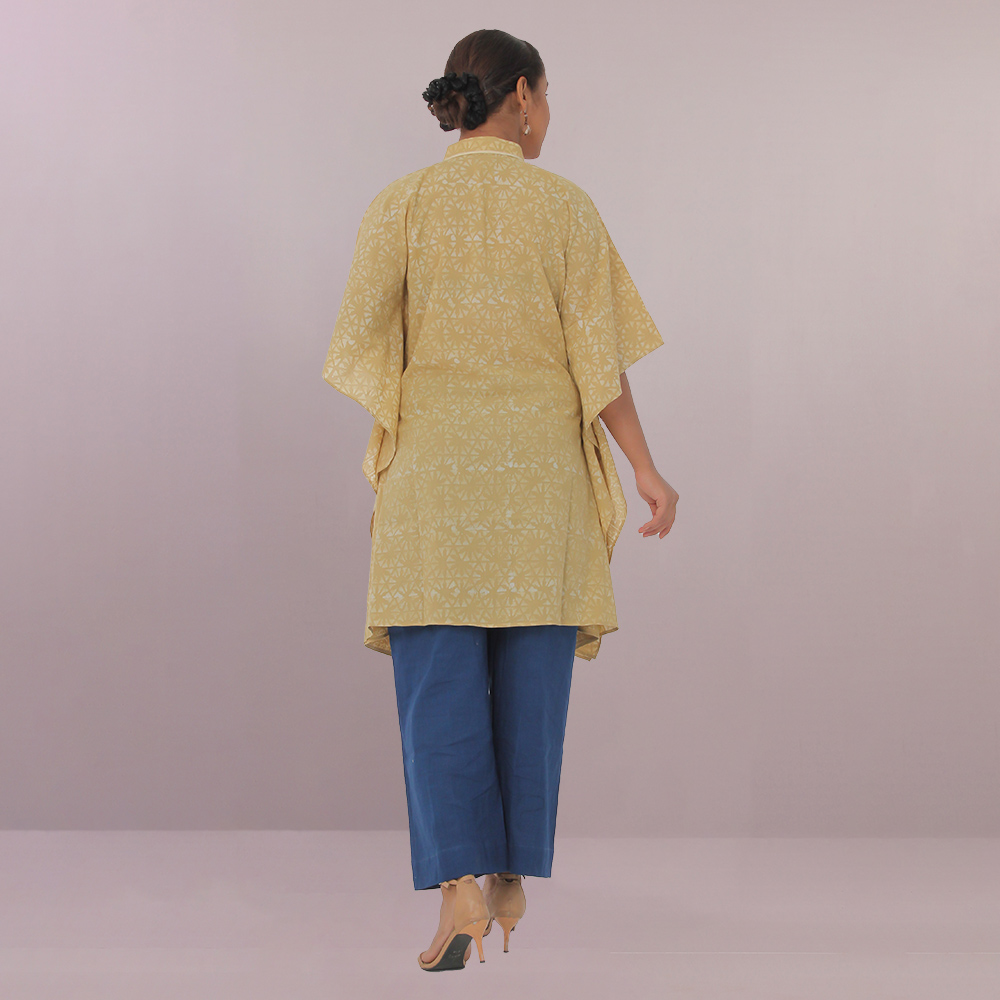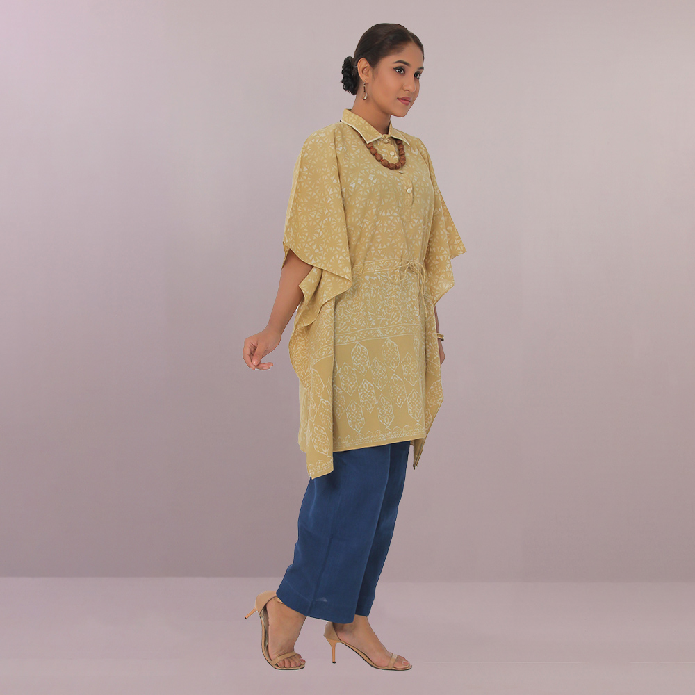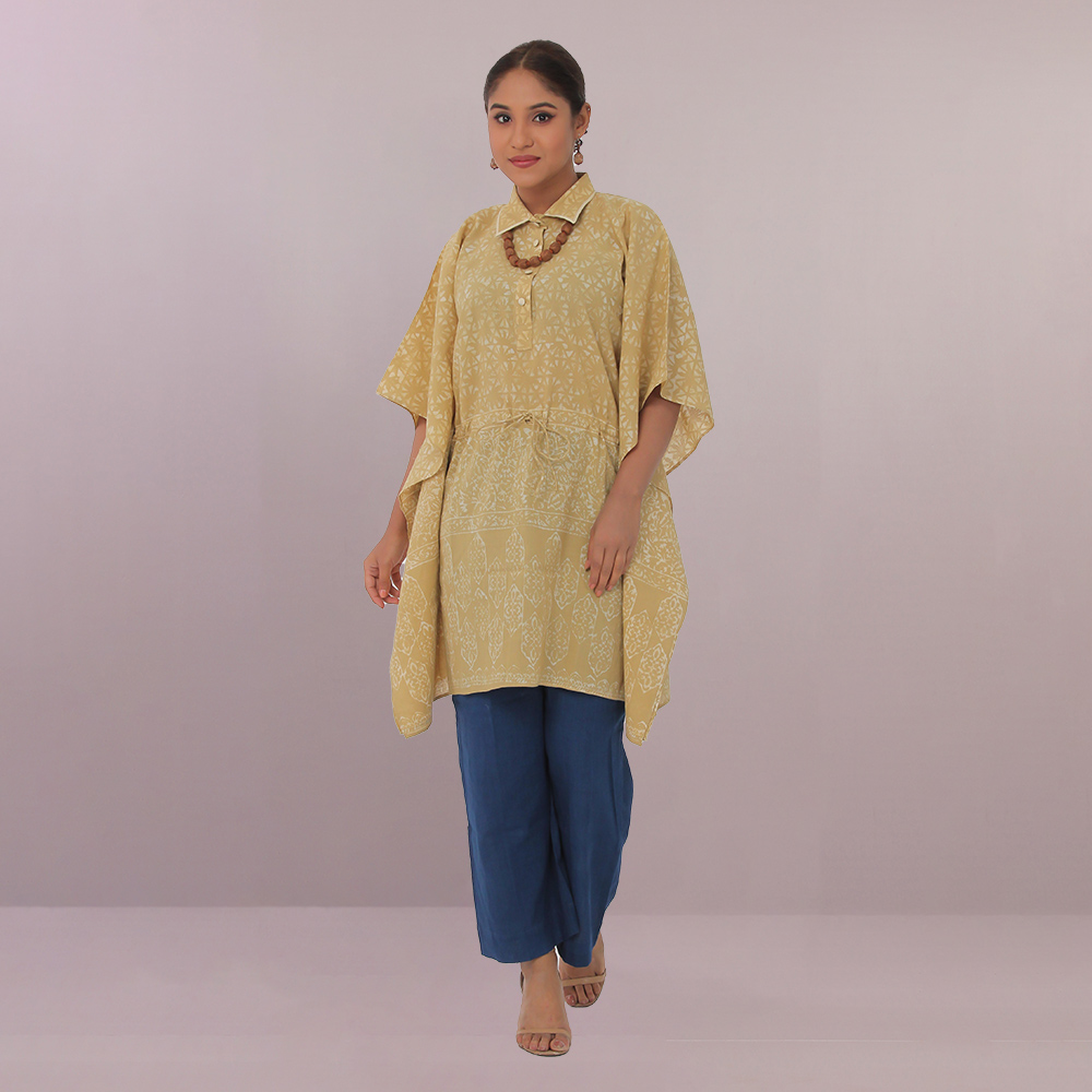 The surface is olive green with lighter-colored veins all over this kaftan , you can wear this comfortable cotton kaftan at any time