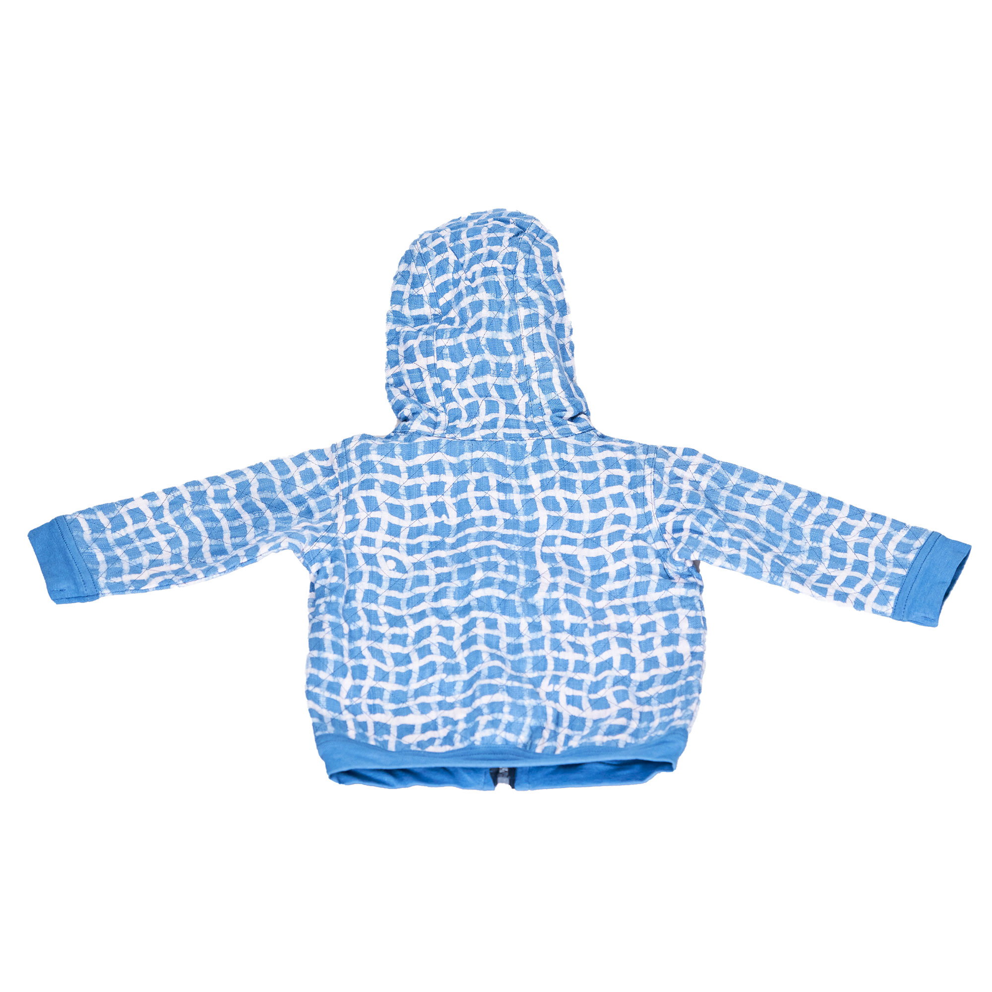 The beautiful tones of blue in this jacket are made from colors extracted from organically grown indigo. Wax print has been used on khadi fabric to make the magical patterns.