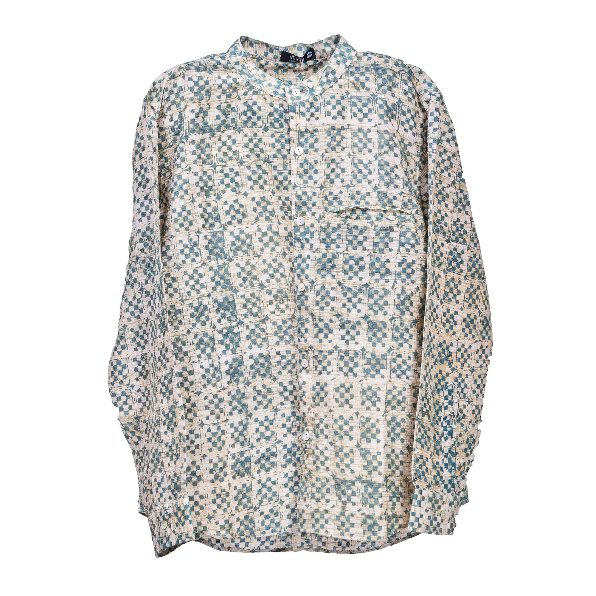 A beguiling combination of colors given off by indigo and myrabalan is used to create the shimmering teal used in this silk shirt. Wax print has been used on endi silk to secure the utmost comfort.