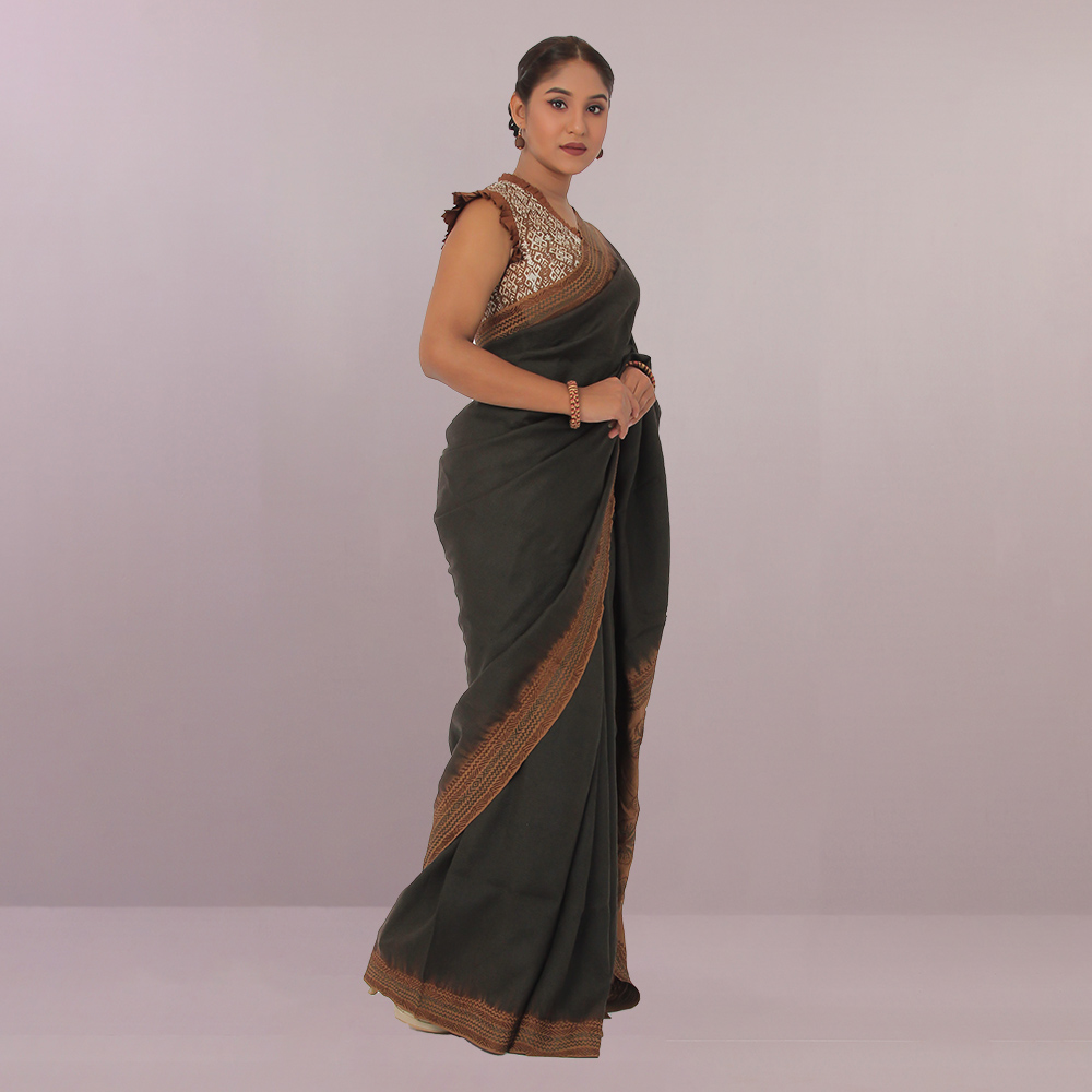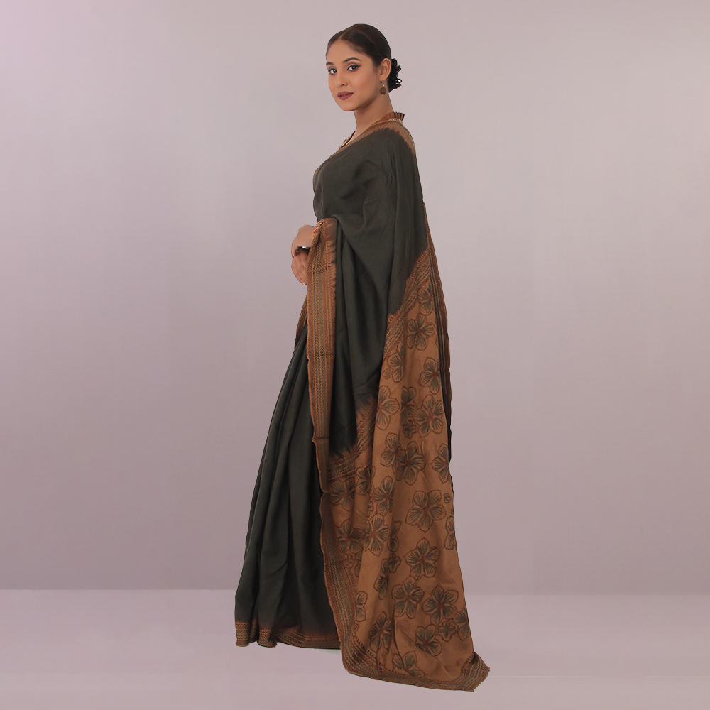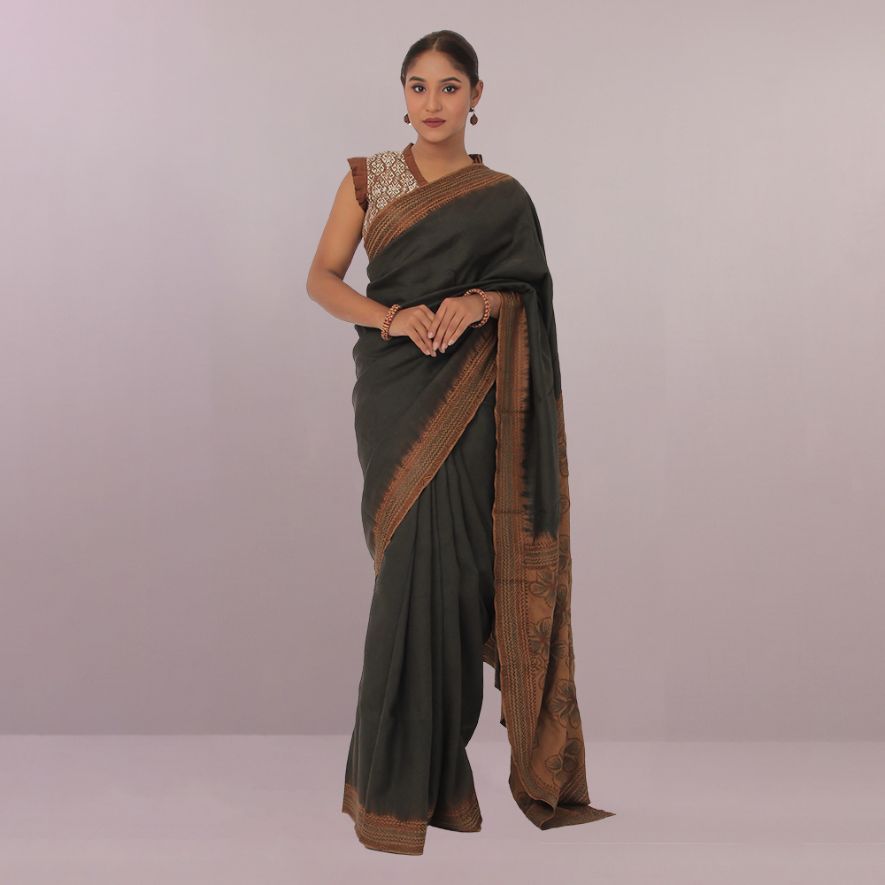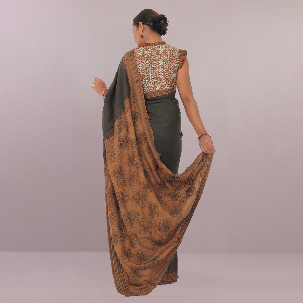 Traditional balala silk saree in brown and black color is decorated by the kantha stitche.. All Aranya products are handmade, using natural fibers and materials within a fair-trade framework.