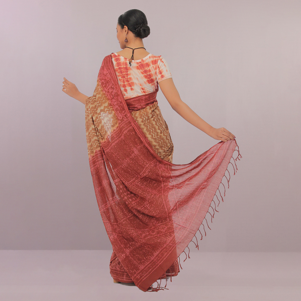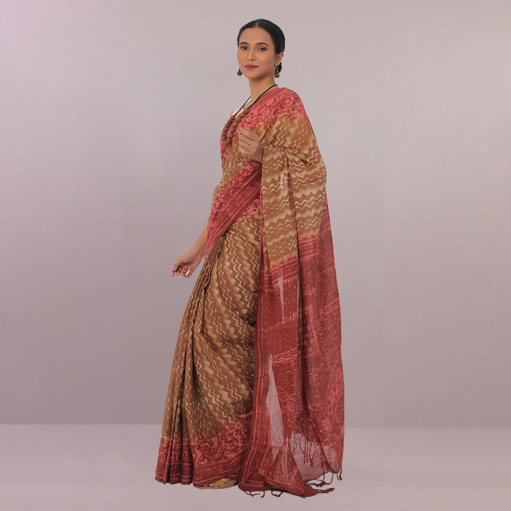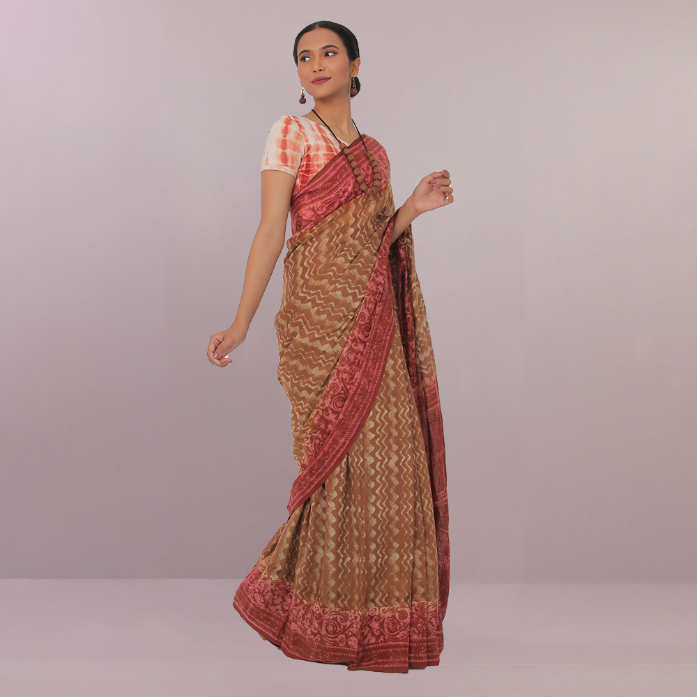 This blended cotton saree is present the fusion of madder & grey which gives it a magnificent look.All Aaranya products are handmade, using natural materials, within a fair trade framework.”