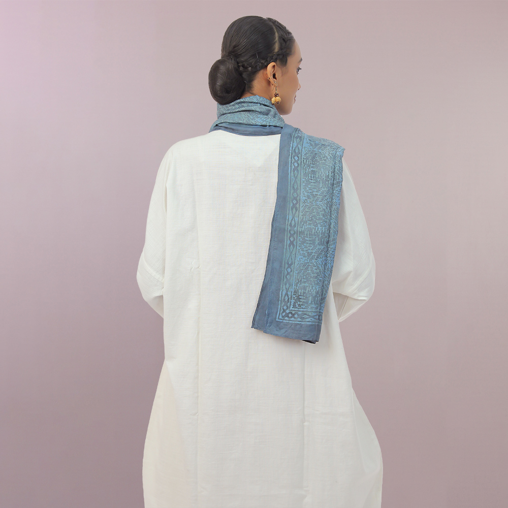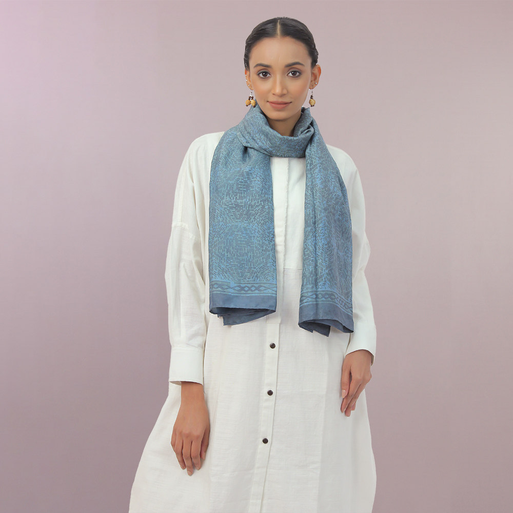 The influencing shade of Indigo is used in this silk scarf with wax print to give the fine detail. All Aranya products are handmade, using natural fibers and materials within a fair-trade framework.