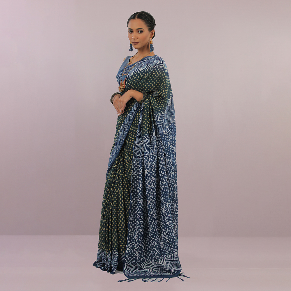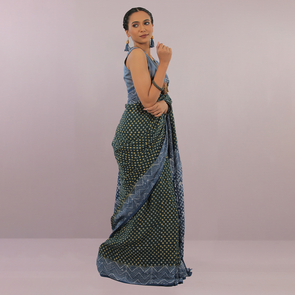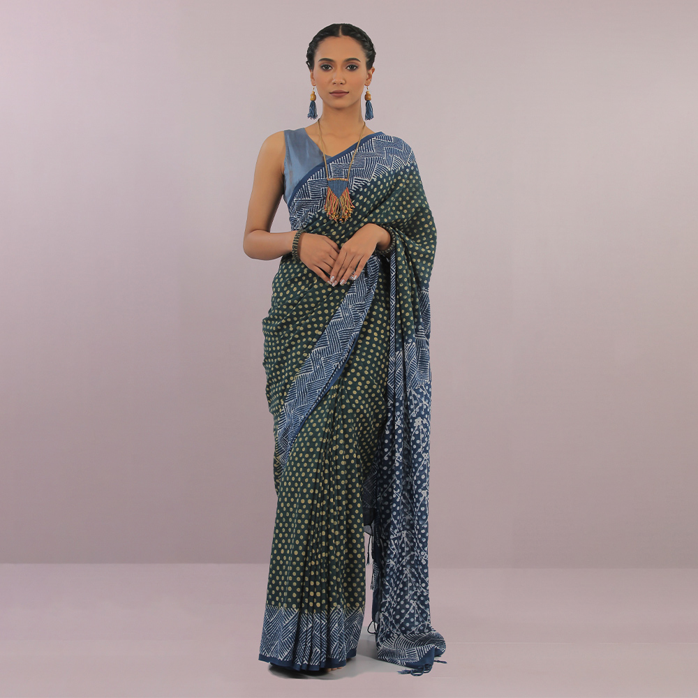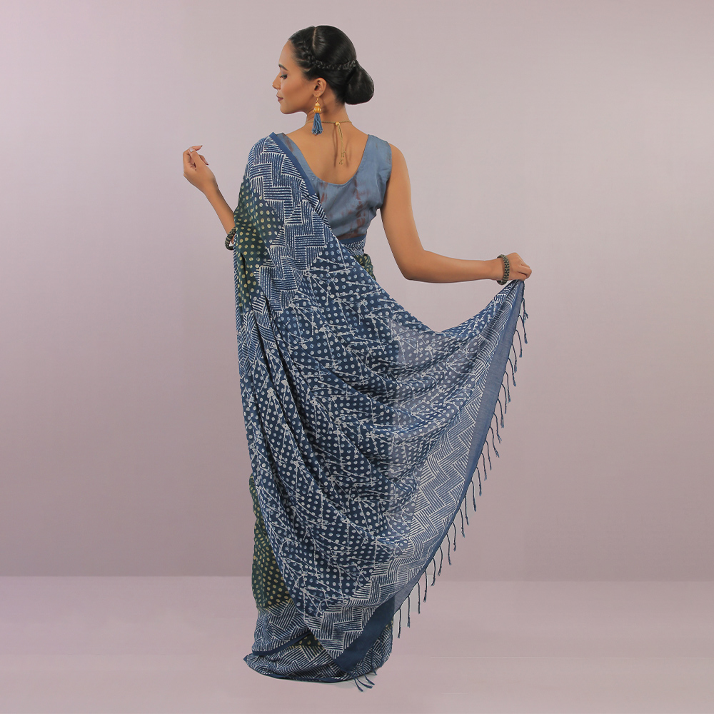 The mesmerizing patterns of blue and golden represent the perfect symphony between water and sun. Paired up with cotton, this mght just become your new favorite choice for the summer.