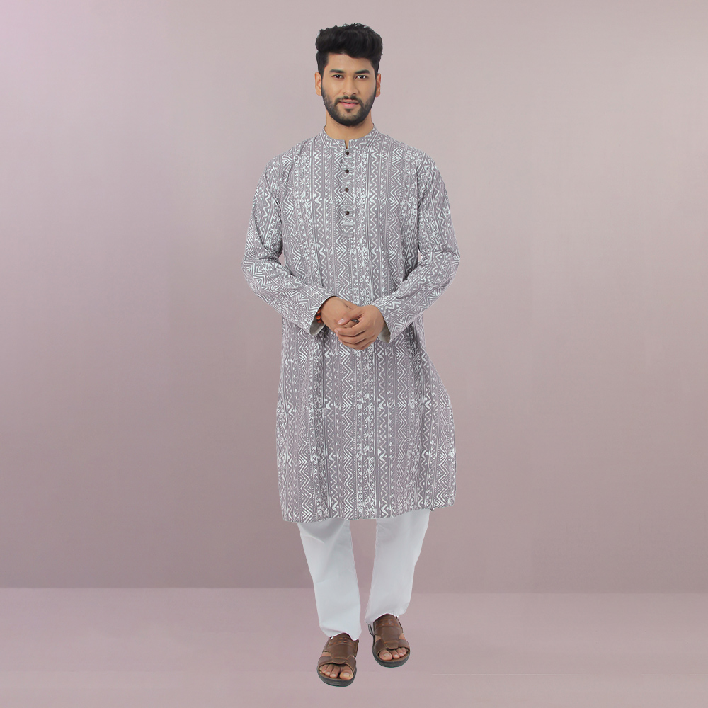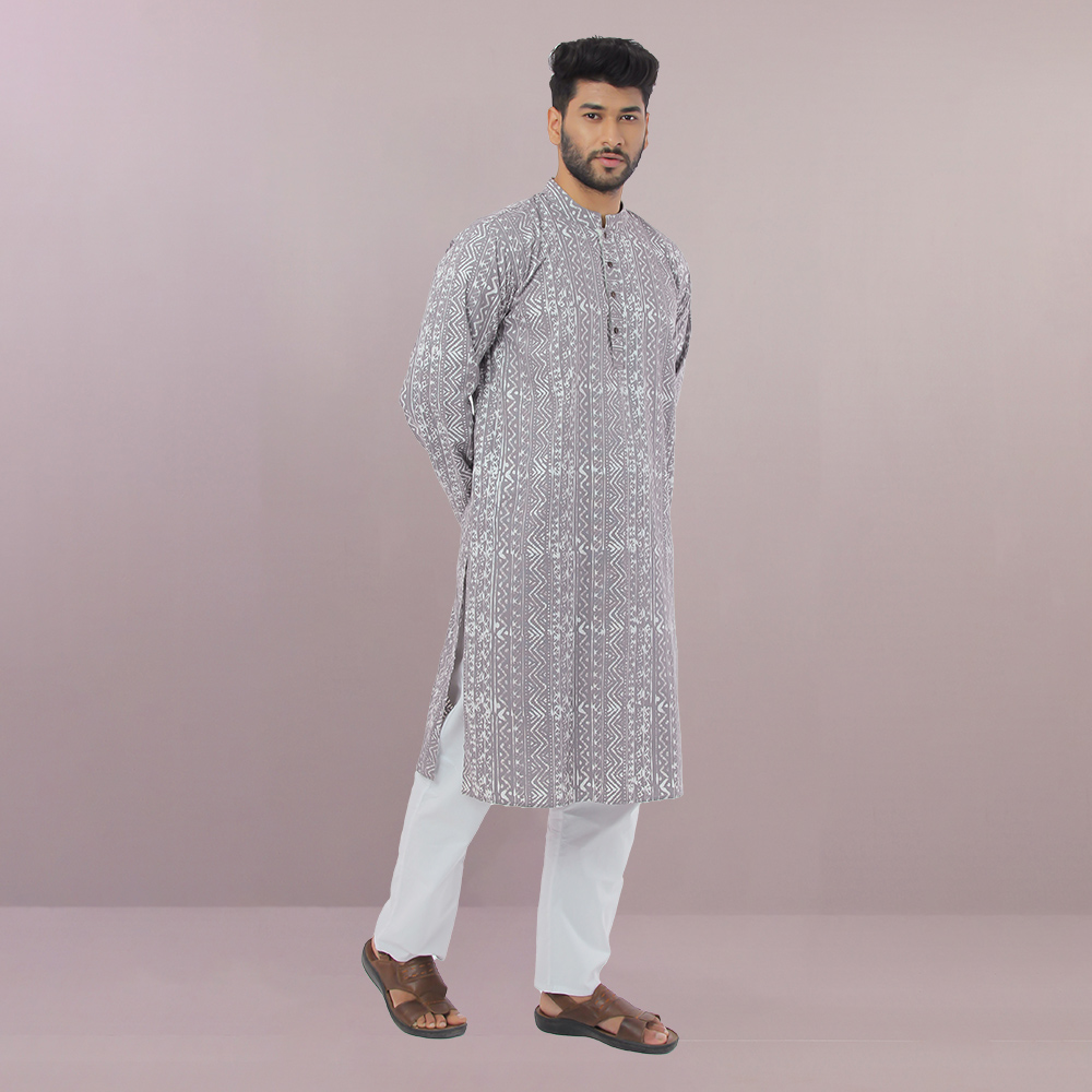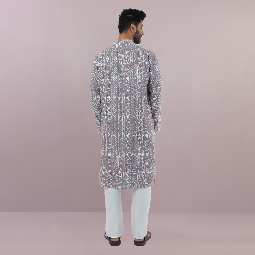 Grey coloured cotton panjabi that has used wax resistant dye for the elegant prints. All Aranya products are handmade, using natural materials, within a fair trade framework.