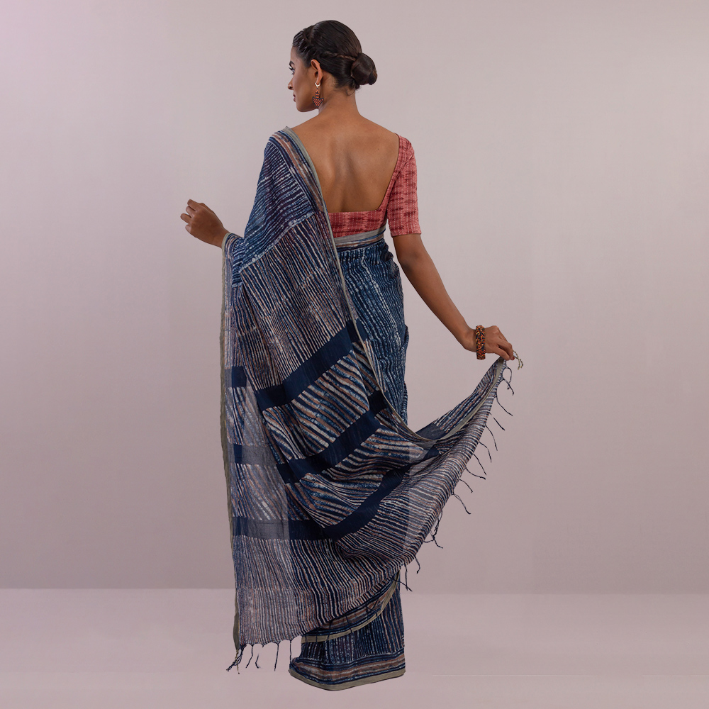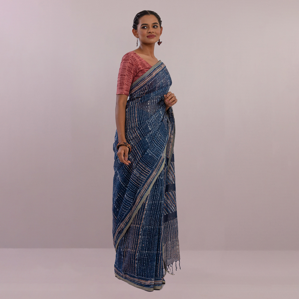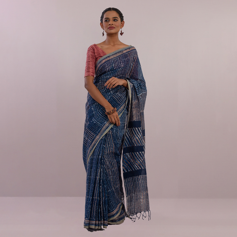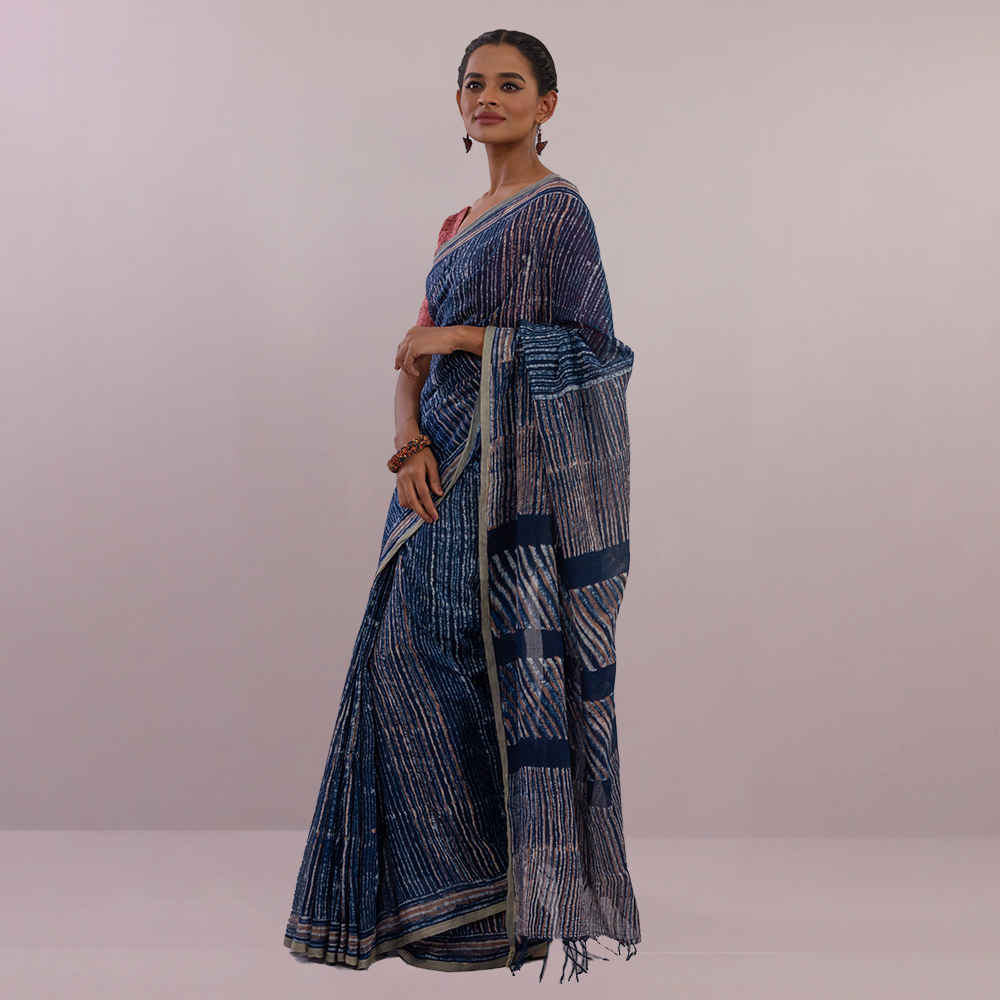 This exclusive wax printed natural dyed cotton kota saree is contains soda pink and of Navy colour. All Aranya products are handmade, using natural materials, within a fair trade framework.