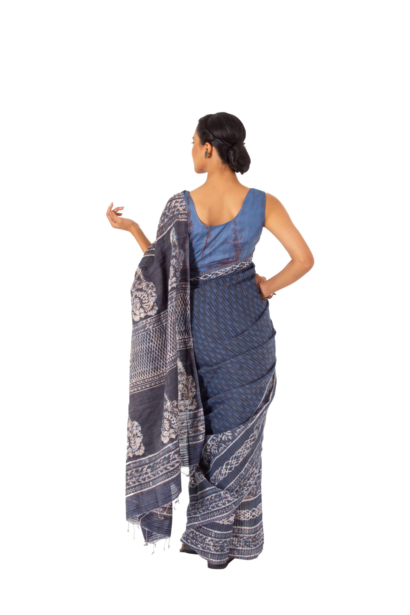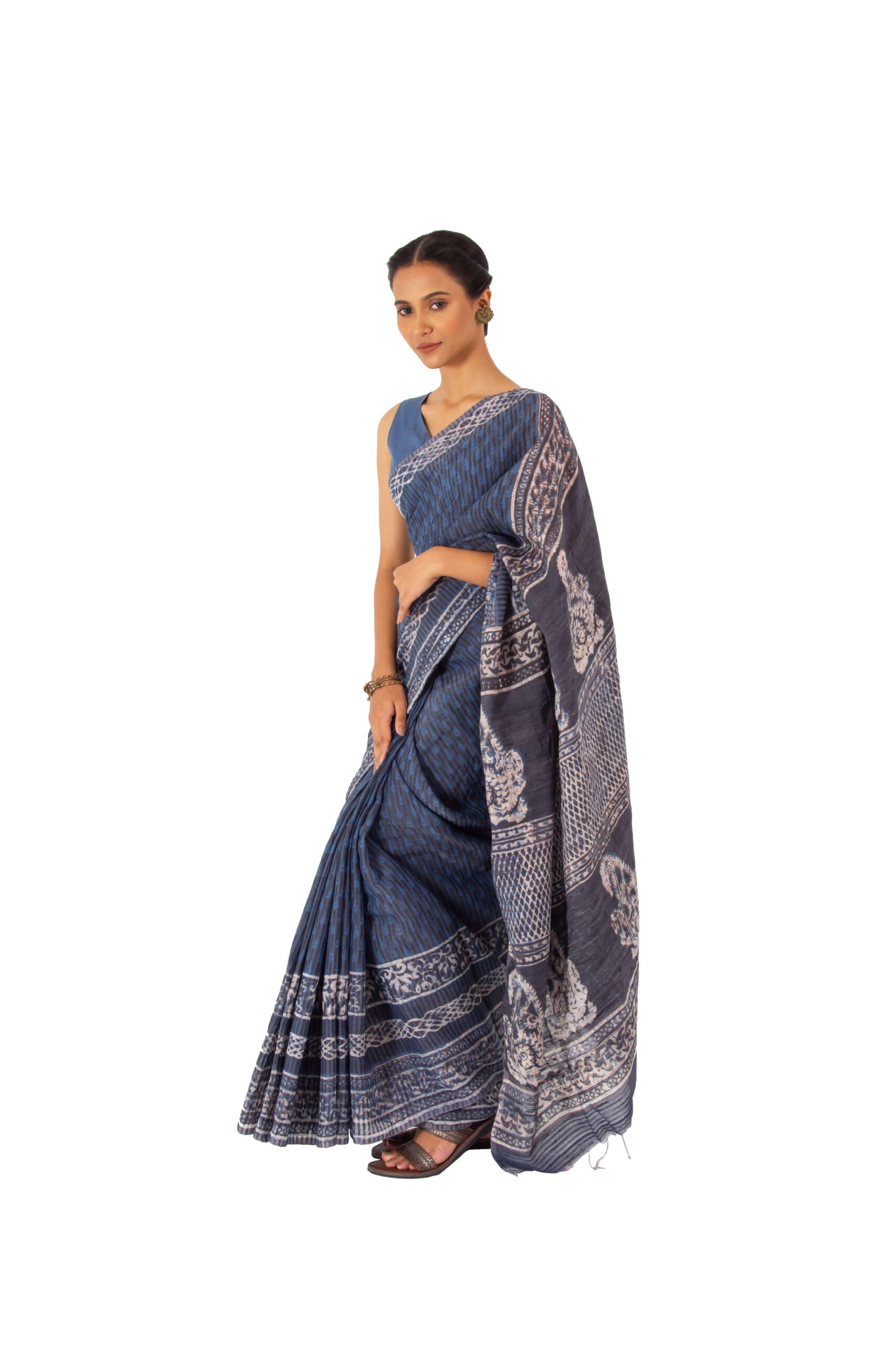 Blue and Gray have been used as dyeing materials on this eri half silk saree. Wax print and Kantha stitch was used to get the elegant design. All Aranya products are handmade, using natural fibers and materials, within a fair trade framework.