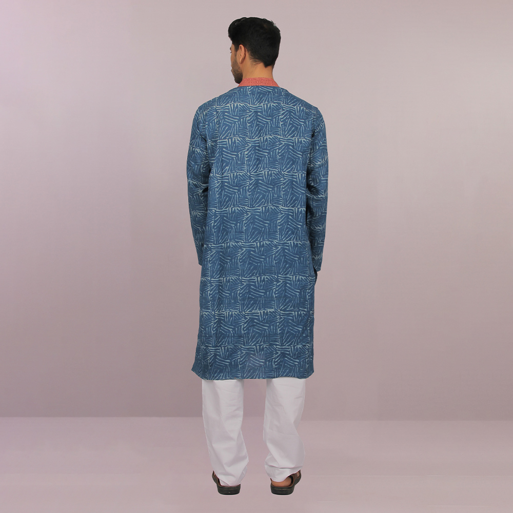 Wax printed design has been outlined on this khadi Panjabi, while naturally dyeing with blue has flourished it’s vibrant colours. All Aranya products are handmade, using natural fibers and materials within a fair-trade framework.