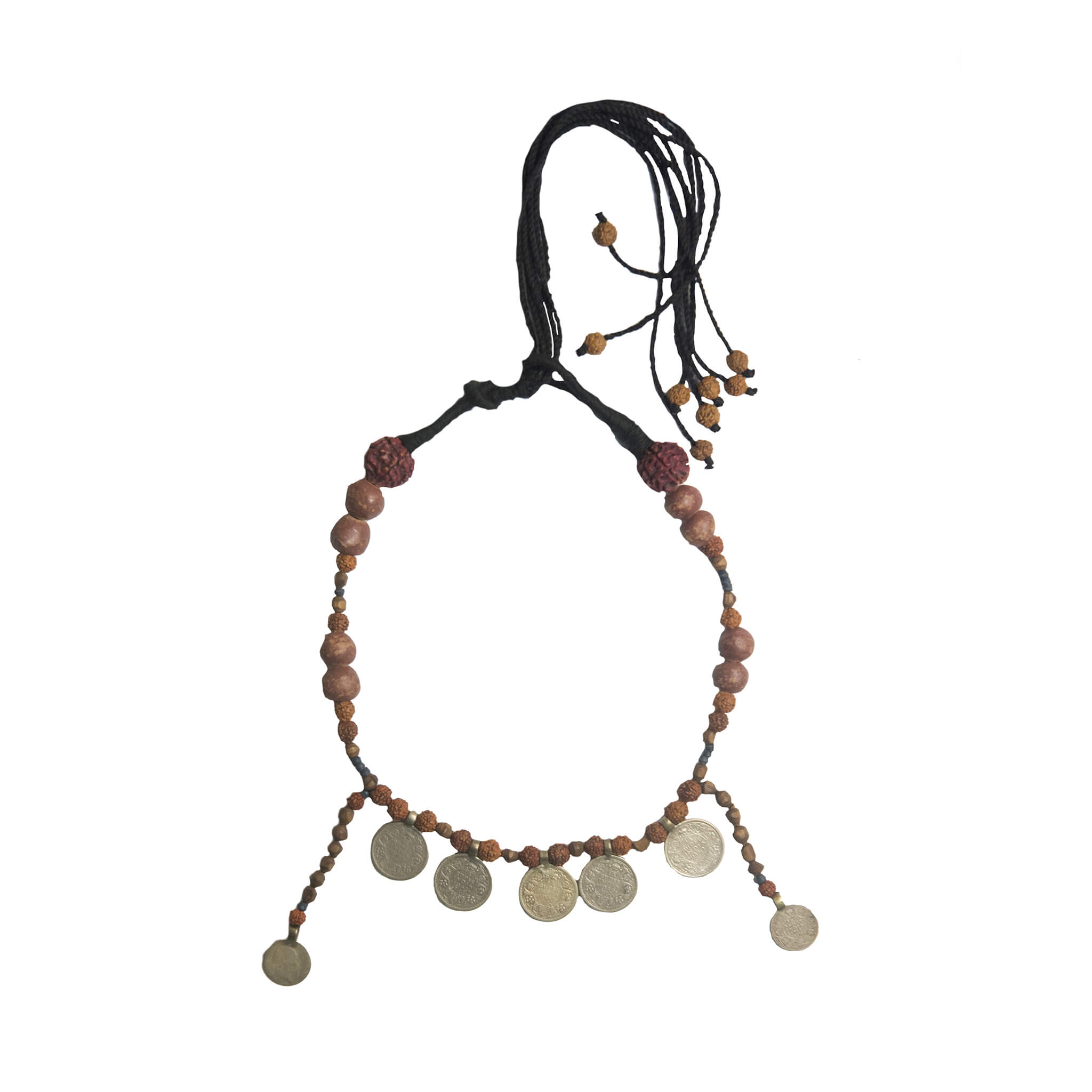 Sterling silver coins have been attached to this choker that has been woven delicately with Terracotta, Rudrakha and wooden beads. The colours are relfections of natural dyes of Indigo and Madder.