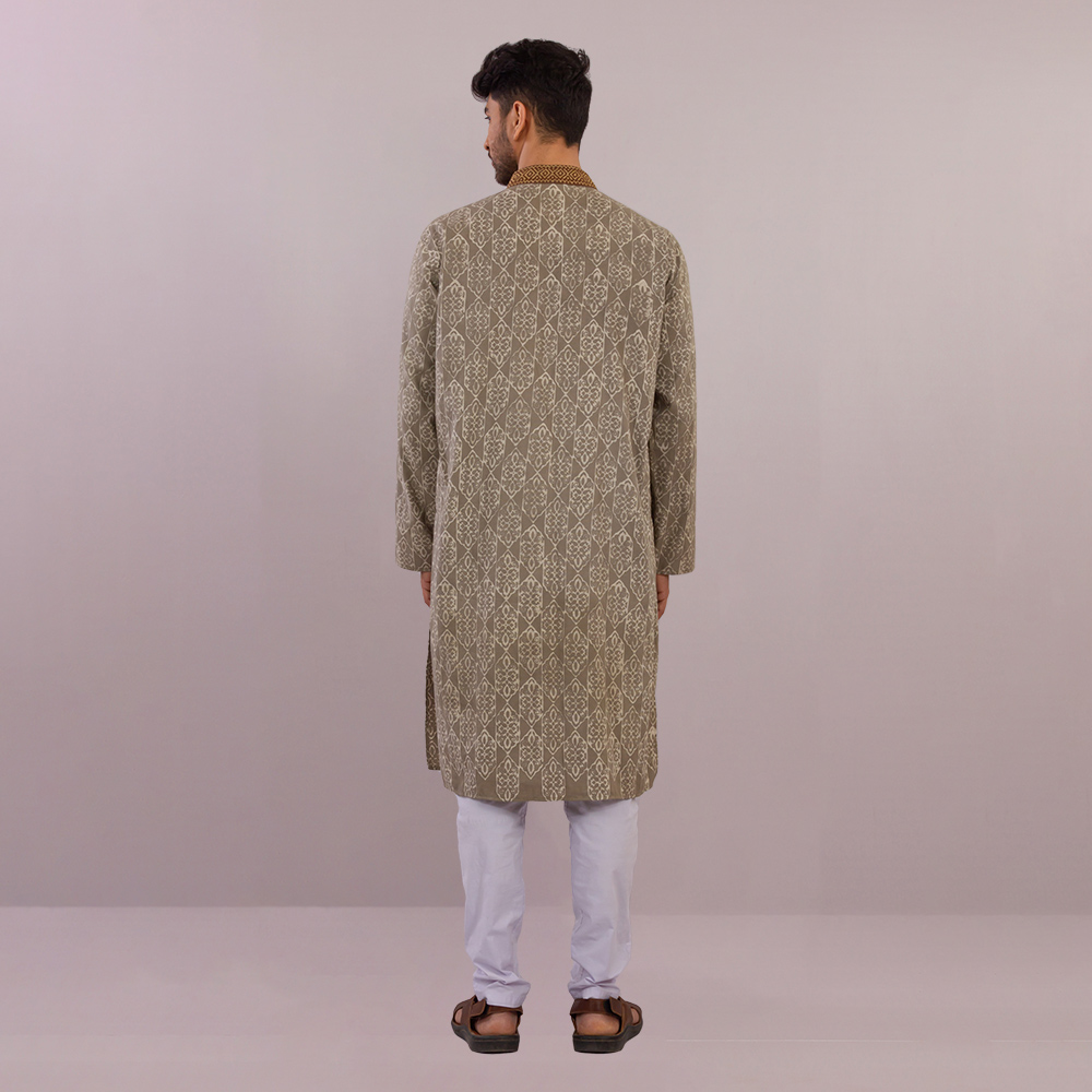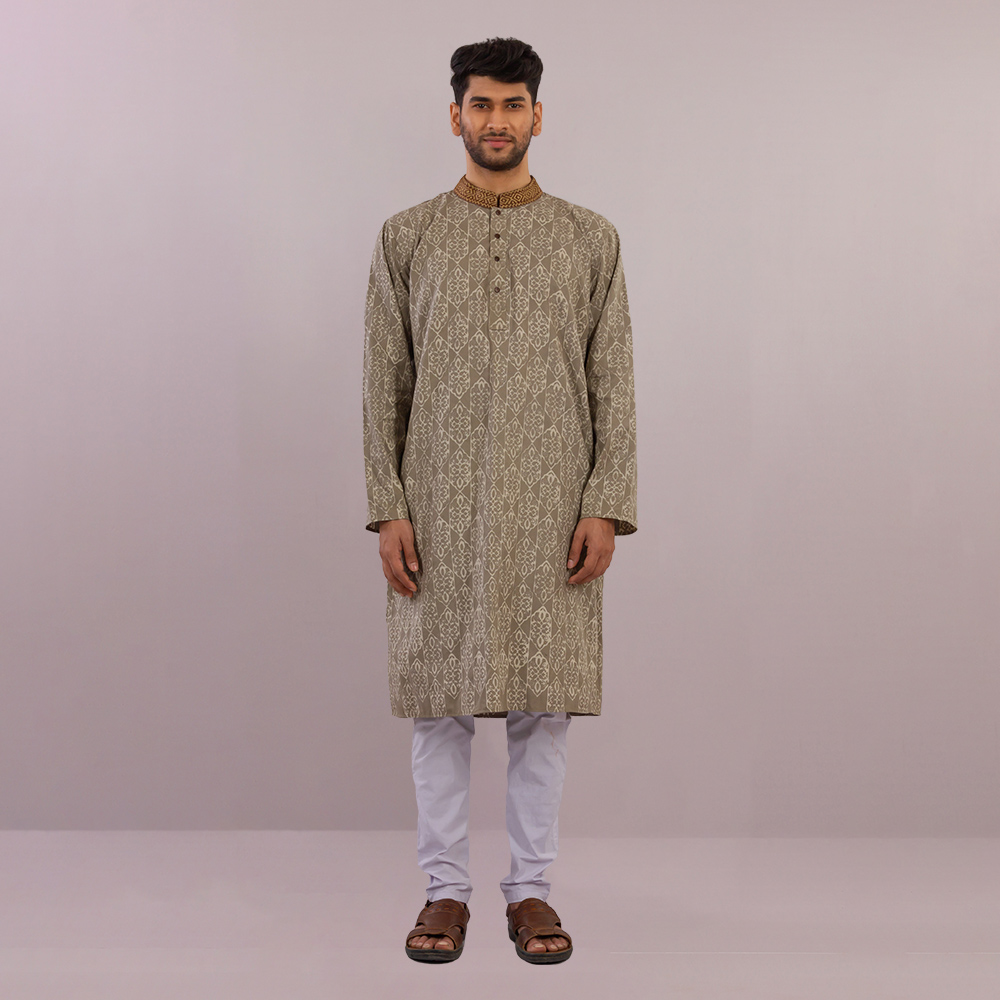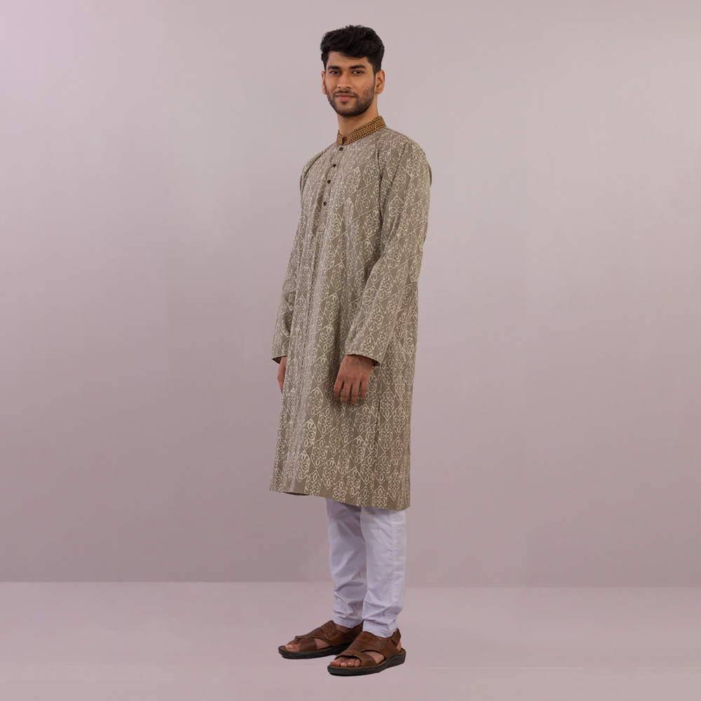 This cotton panjabi brings in the hues of olive from nature. The process of wax unveils the unique designs of this panjabi.