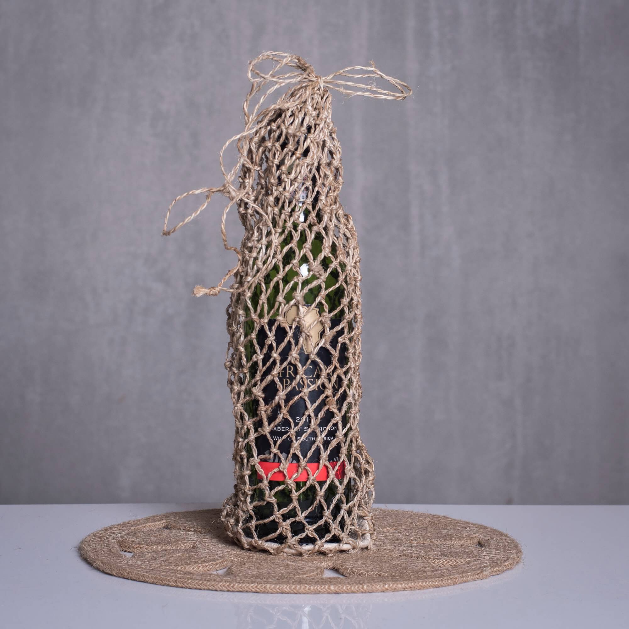 This wine bag is completely handmade from jute. Natural color is preserved to keep it traditional. All Aranya products are handmade, using natural materials, within a fair trade framework.
