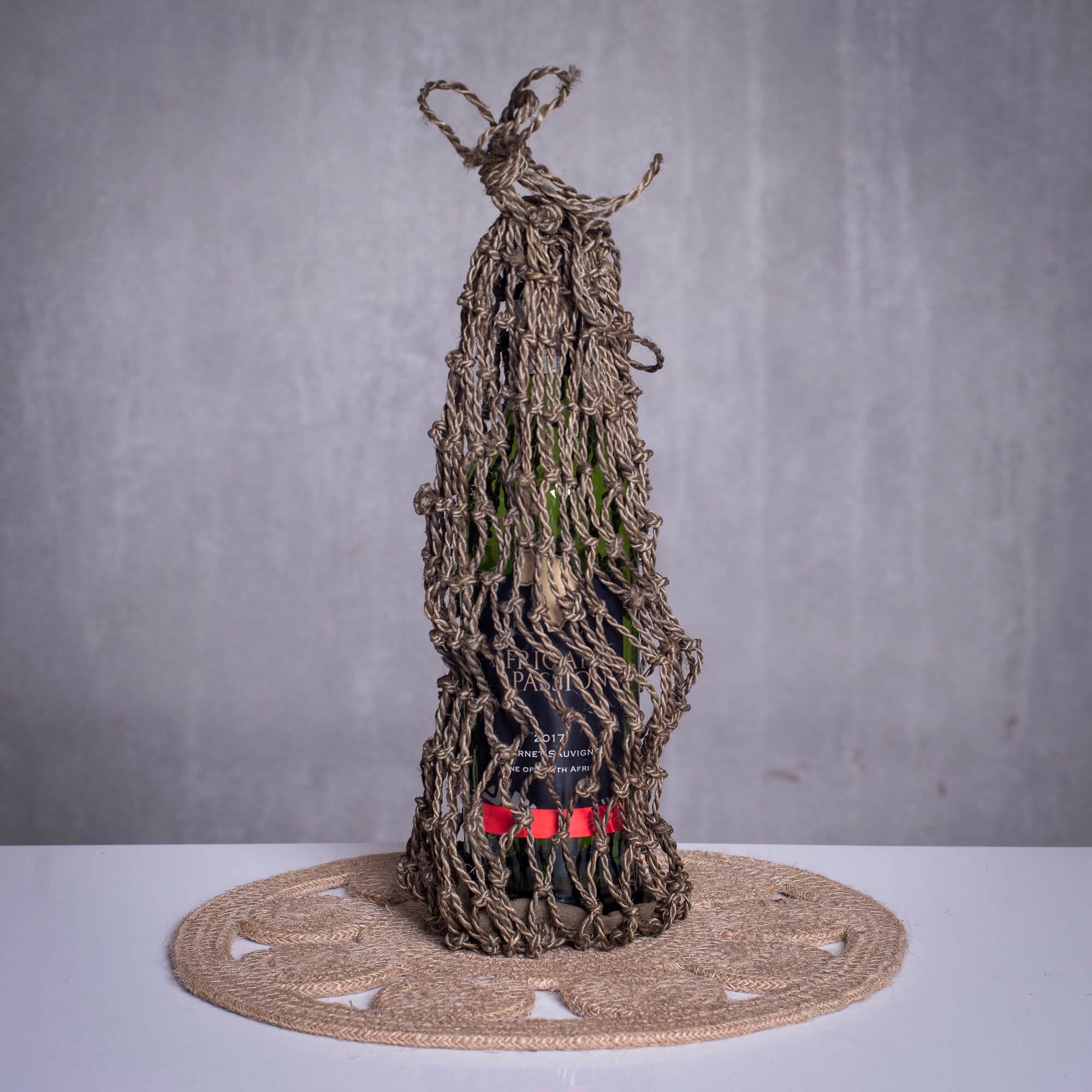 This wine bag is completely handmade from jute. Olive color used in this bag is extracted from organic material. All Aranya products are handmade, using natural materials, within a fair trade framework.
