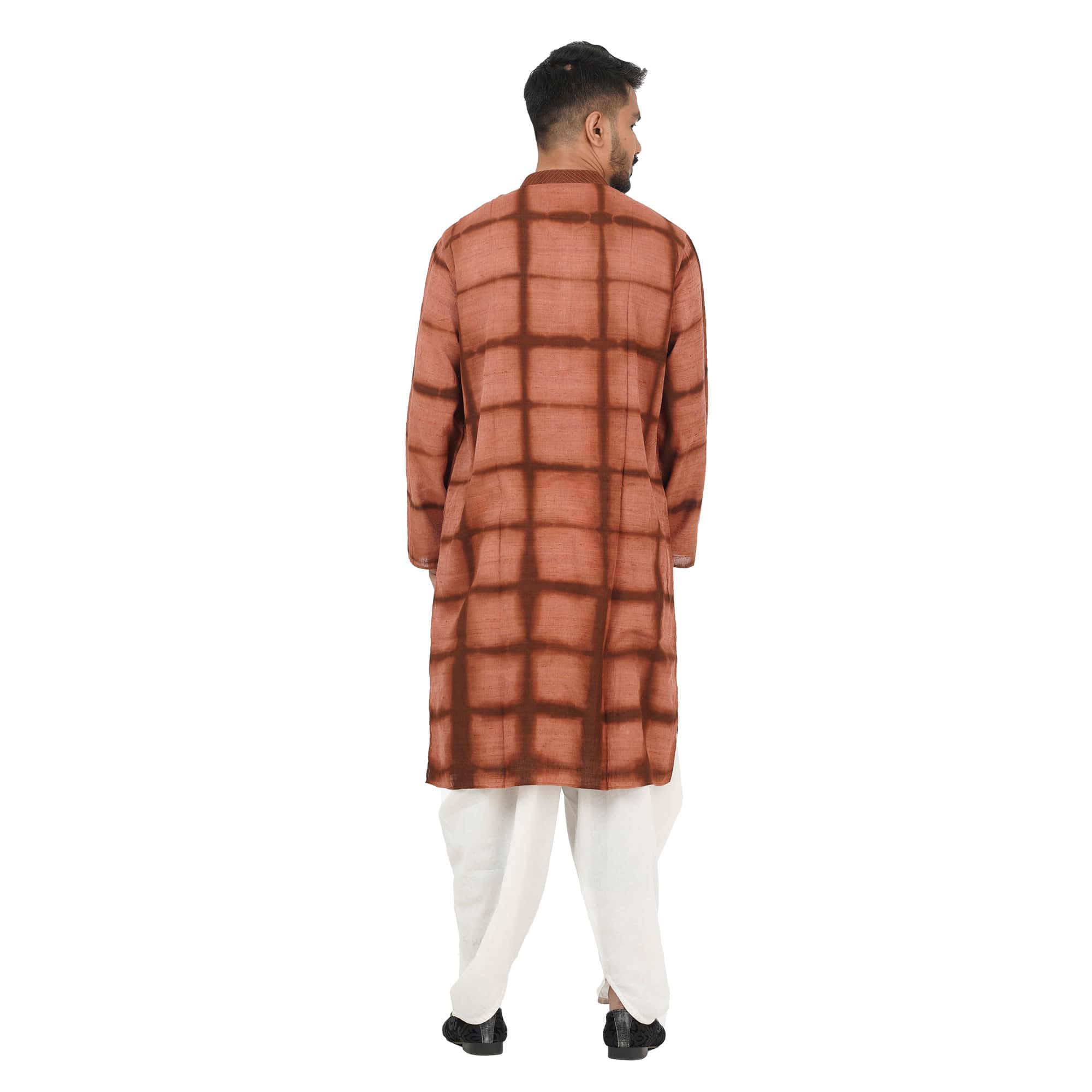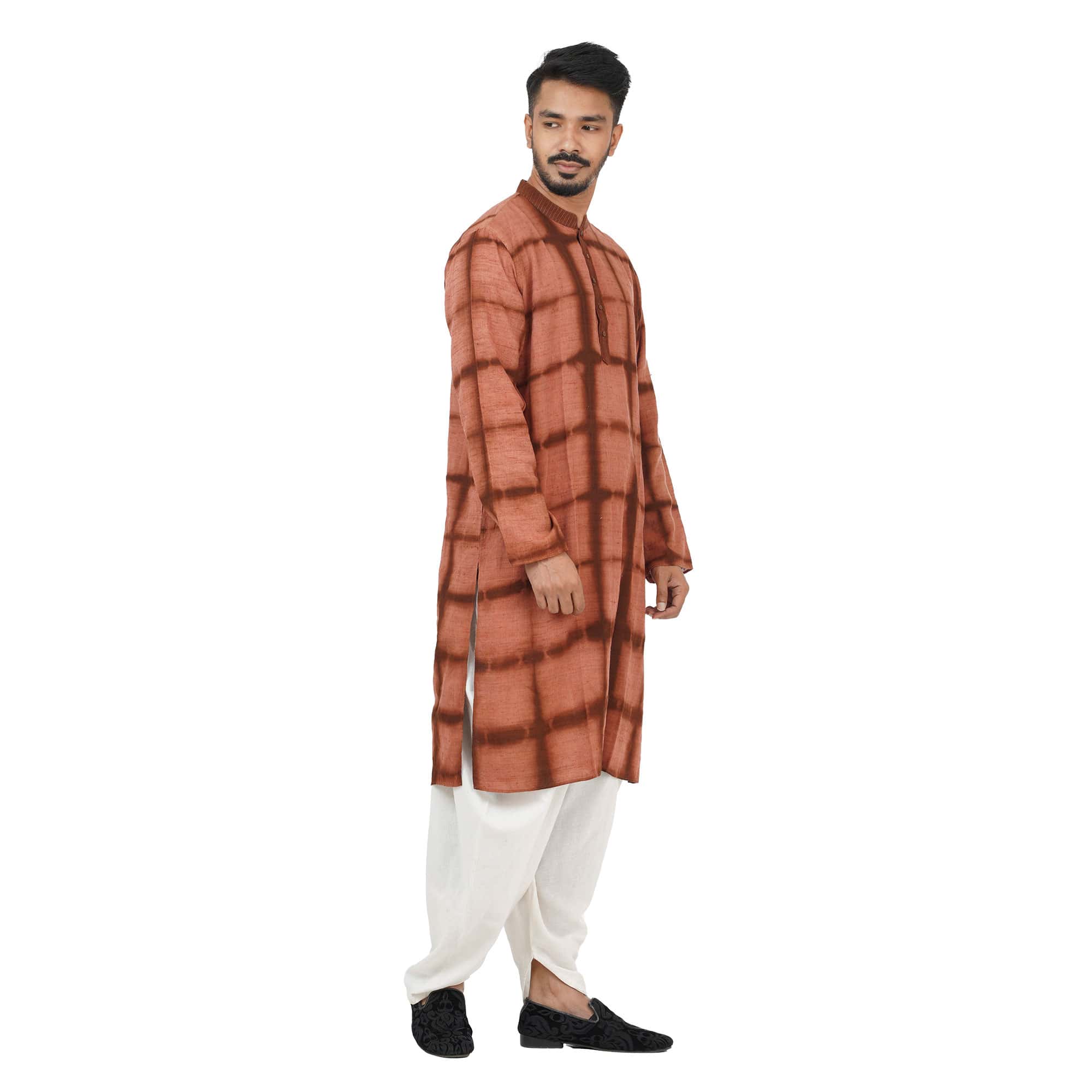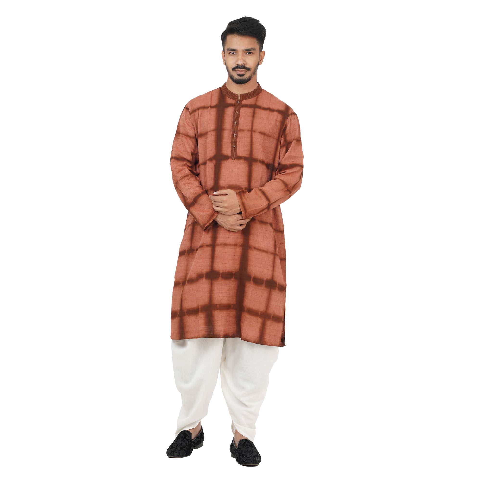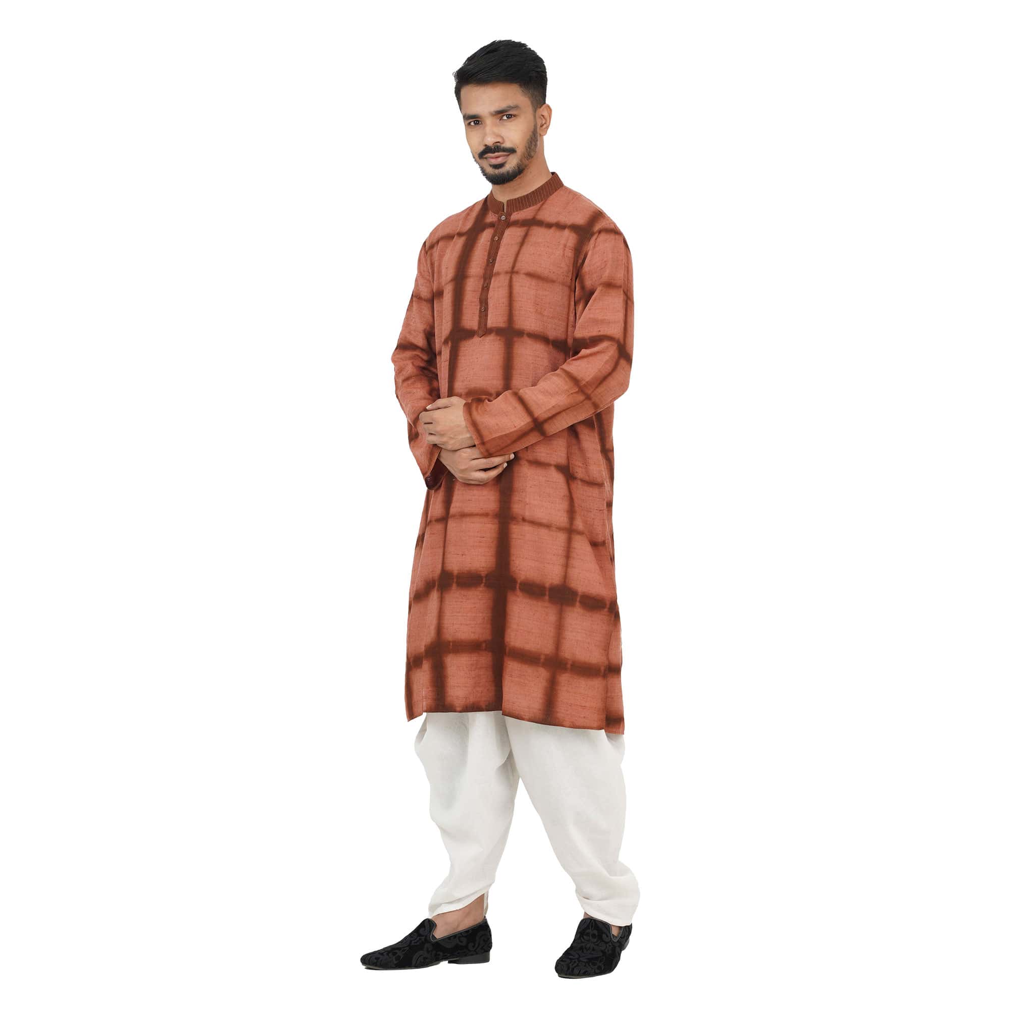 This cotton panjabi brings in the hues of brown from nature. The process of tie-dye unveils the unique designs of this panjabi.